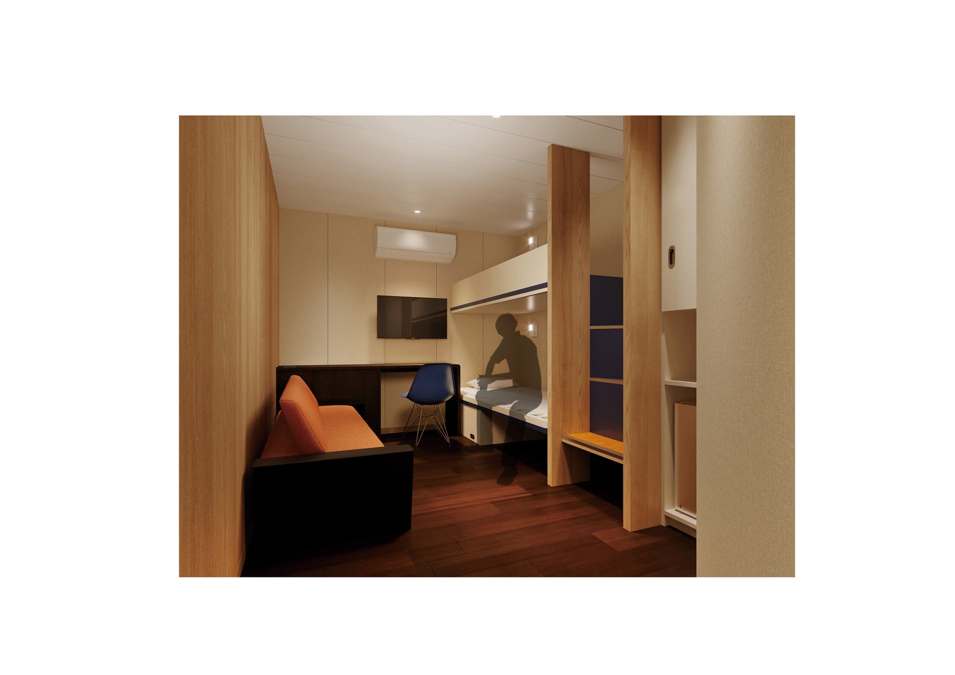 さらに既存船より貨物車両の積載スペースを拡張し、客室の全室個室化によりトラックドライバーの方々により快適に過ごしていただける空間を提供することで、モーダルシフトをサポートし、「物流の2024年問題」の解決に努めます。また、フィットネスルームやキッズスペース、プロムナード、展望浴場、サウナなどの充実したパブリックスペースや、ペットと一緒に乗船できるウィズペットルームも新たに導入しました。