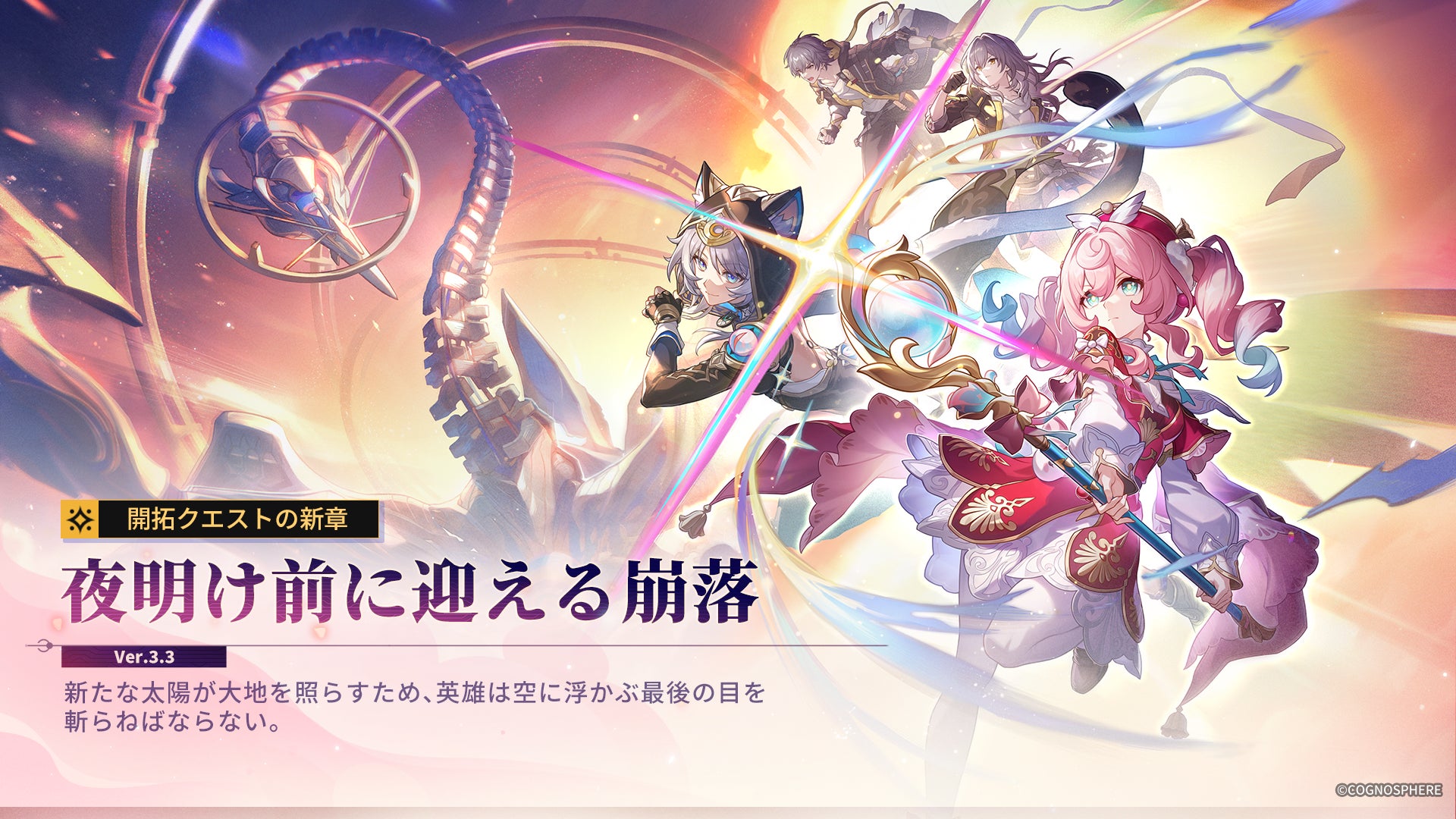 グローバルエンターテインメントブランドHoYoverseは、スペースファンタジーRPG『崩壊:スターレイル』にて、本日5月21日(水)よりVer.3.3「夜明け前に迎える崩落」にアップデート、そして限定星5キャラクター「ヒアンシー」(CV:羊宮妃那)が登場するイベント跳躍「晨昏を穿つ虹」を開催したことをお知らせいたします。そのほかゲーム内イベント情報をご紹介いたします。