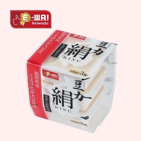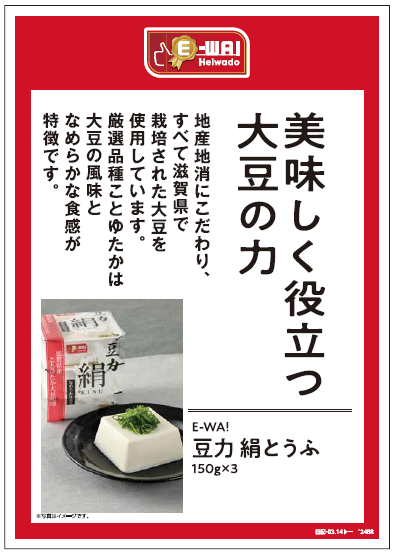 2014年の平和堂こだわりブランドE-WA!シリーズデビュー当初から販売し、2023年6月に累計販売数1,000万個を突破したするロングセラー商品です。今回販売する「E-WA! 豆力 絹とうふ」と同じ、滋賀県産大豆「ことゆたか」を原料に使用しています。