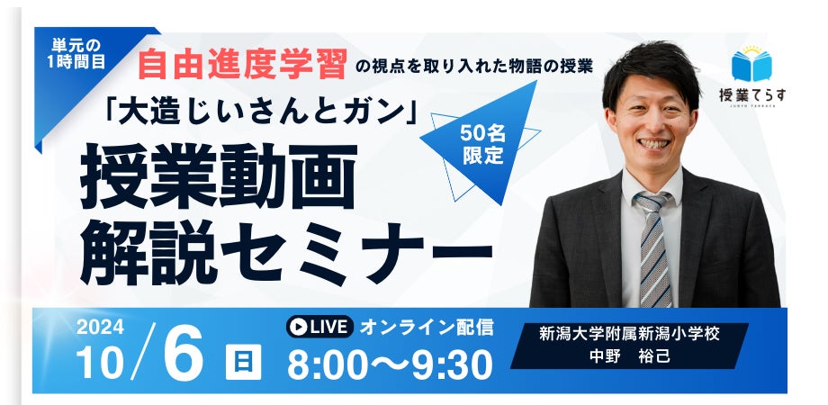 株式会社NIJIN(本社:東京都江東区、代表取締役:星野達郎)が運営する教員研修プラットフォーム『授業てらす』は、全国の⼩中学校教員を対象に、中野裕己先生の授業動画をオンラインで見て学ぶ『「大造じいさんとガン」授業動画解説セミナー』を、2024年10月6日(日)に開催いたします。