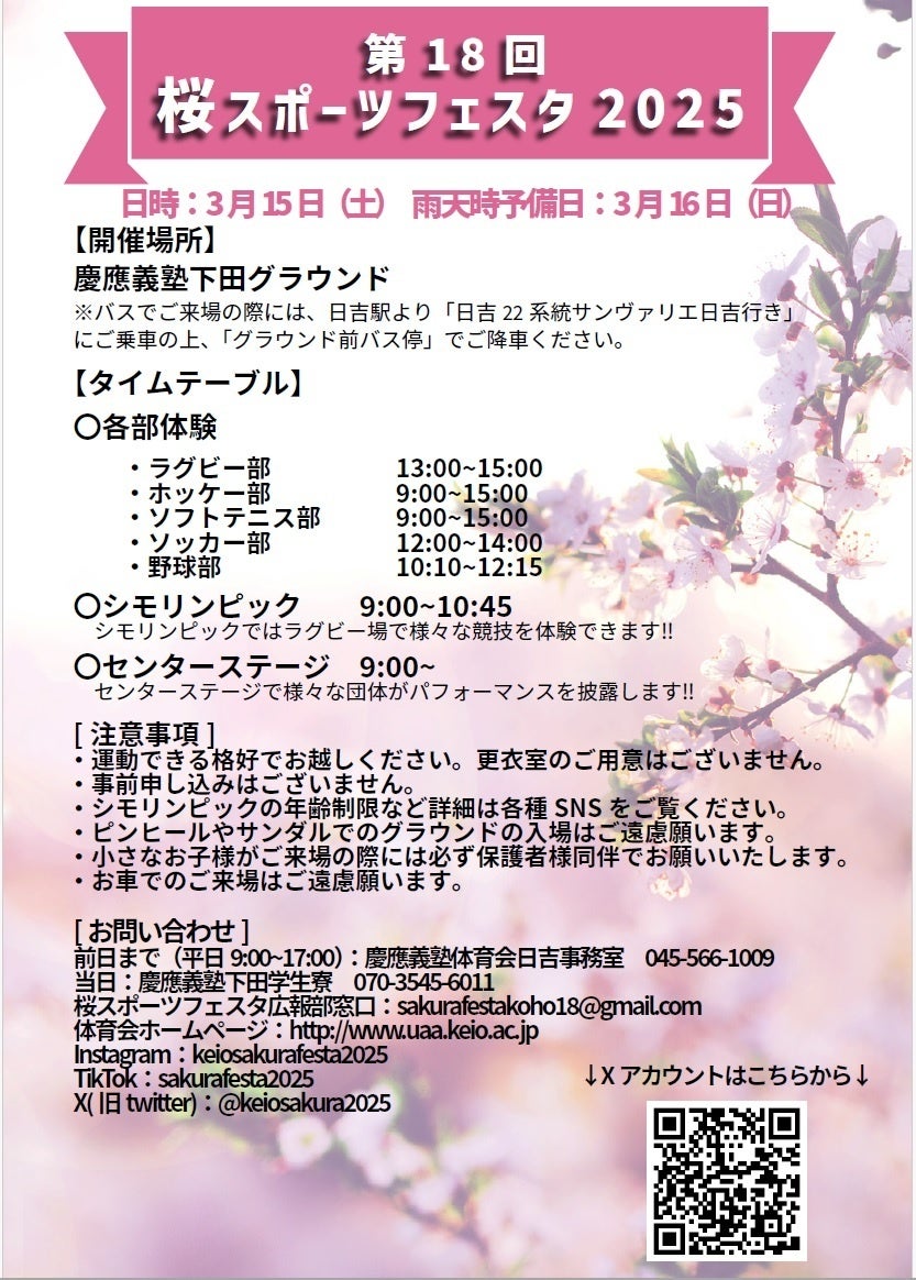 3月15日(土)、慶應義塾体育会は「地域と学生の交流」をテーマに、「第18回桜スポーツフェスタ2025」を下田グラウンドおよび下田学生寮(横浜市港北区日吉本町)にて開催いたします。