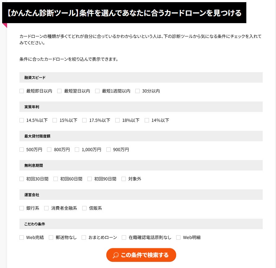 カードローンカテゴリの記事内に絞り込み機能を実装しました。
