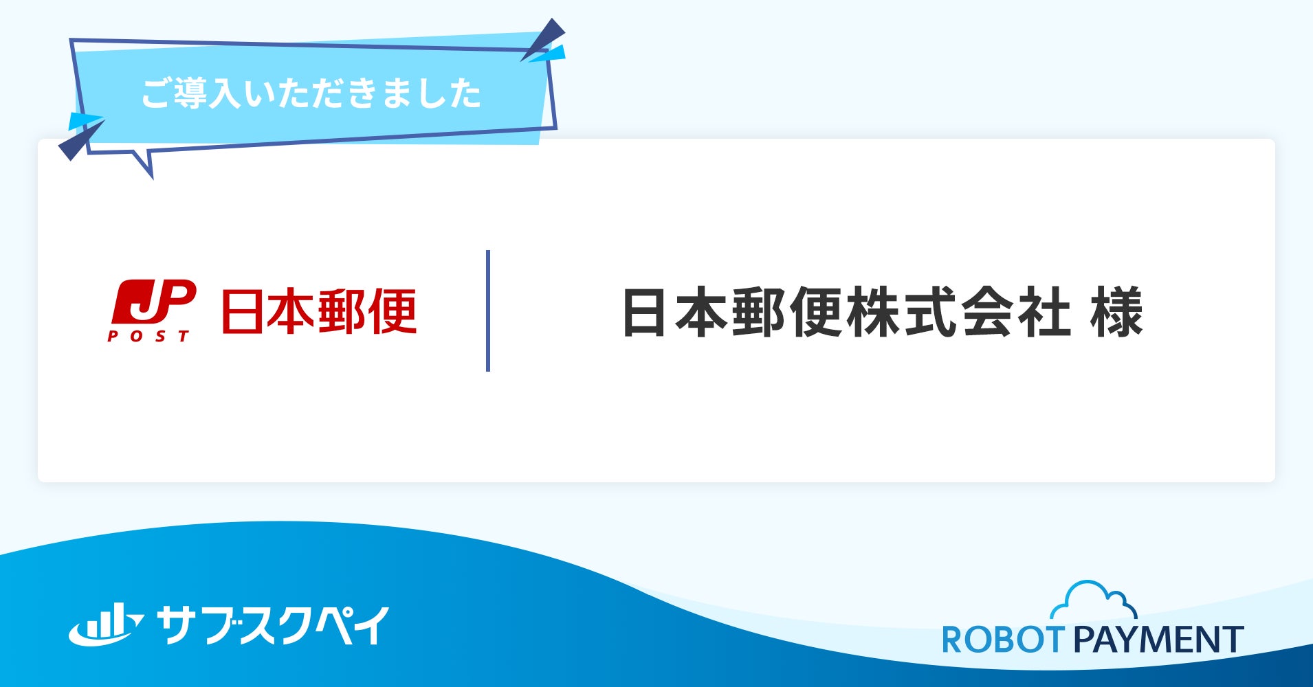 株式会社ROBOT PAYMENT(本社:東京都渋谷区、代表取締役:清久 健也、以下「ROBOT PAYMENT」)は、顧客管理・自動課金クラウド「サブスクペイ」が、日本郵便株式会社(本社:東京都千代田区、代表取締役社長:千田 哲也、以下「日本郵便」)に導入されたことをお知らせします。