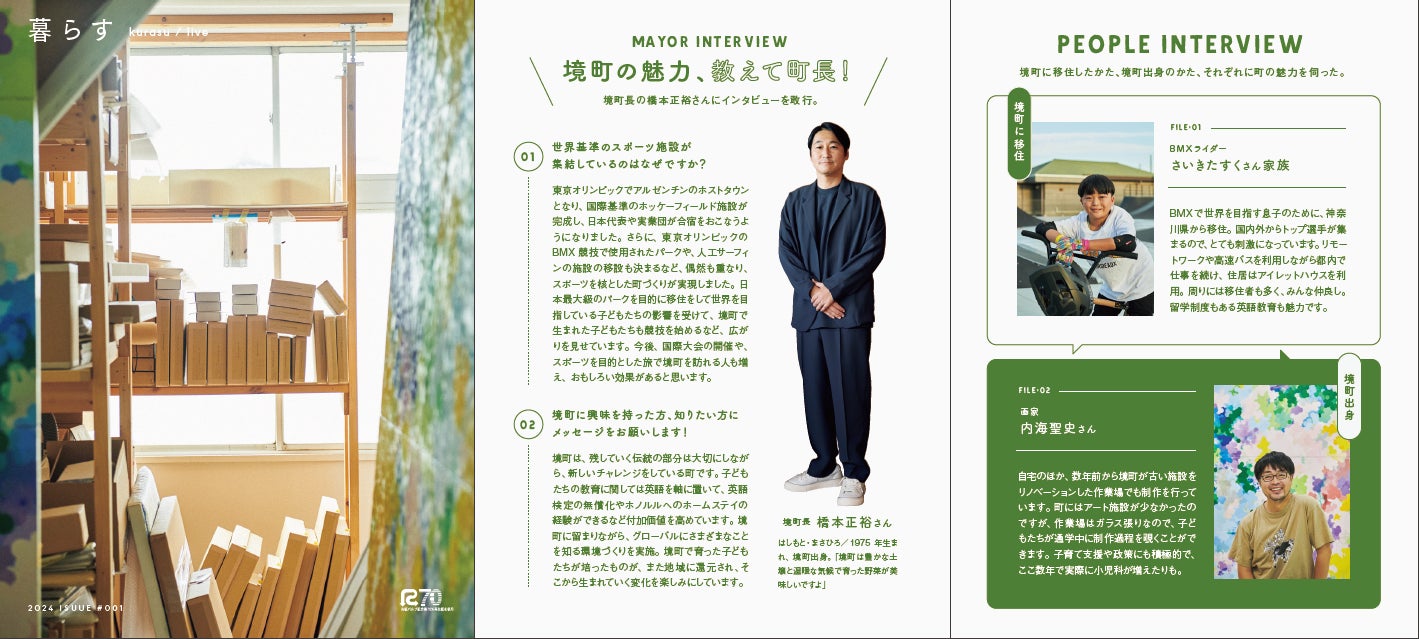 境町在住の現代アーティスト 内海聖史氏によるアートをカバーデザインに使用し、「買う、食べる」「暮らす」「体験する」の3項目構成で境町の魅力をまとめあげた広報誌を制作。町外の方に境町の魅力を伝えることはもちろん、町内の方にもまだまだ知らない地元の面白さをお伝えします。今後も定期的なアップデートを予定しています。