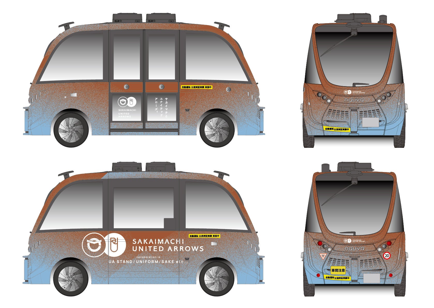 境町を走る自動運転バス・境町~東京駅間を結ぶ高速バスにも、UAオリジナルデザインが登場。境町をイメージしたブルーとUAのオレンジをグラデーションにしたデザインで、町民の足として町内外を巡ります。