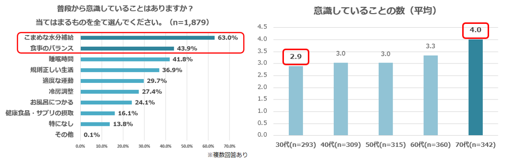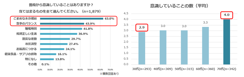 「こまめな水分補給」、「食事のバランス」など食事に関わる項目がTOPでした。また日頃の生活習慣を意識している傾向も見受けられ、「睡眠時間」「規則正しい生活」なども高い結果となりました。