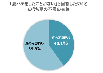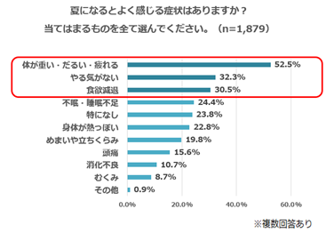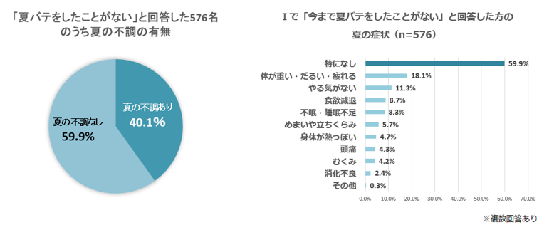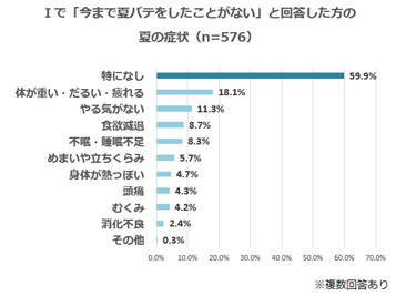 また、「夏バテをしたことがない」と回答した576名の内40.1%の方でも「体が重い・だるい・疲れる」「やる気がない」「食欲減退」をはじめとした不調を感じていることがわかりました。夏の不調の自覚症状はあるが、夏バテだと認識していない方にも、予防と対策が必要のようです。