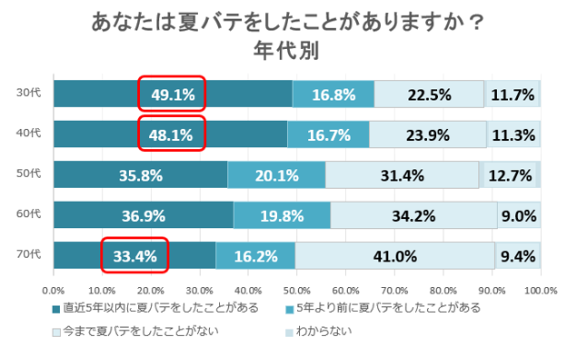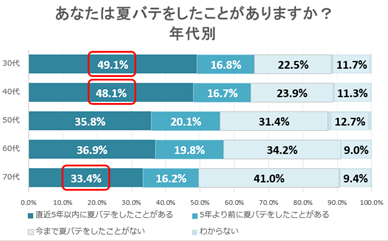 ◇直近5年以内の夏バテ経験者の中でも、30代49.1%、40代48.1%、70代以上33.4%と