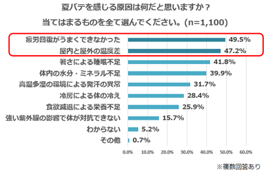 夏バテをしたことがあると回答した1,100人に対する「夏バテを感じる原因は何だと思いますか?」という質問で最も多かった回答は「疲労回復がうまくできなかった」で49.5%という割合でした。続いて多かったのは「屋内と屋外の温度差」という回答で47.2%でした。