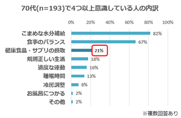 また、70代の方で普段から4つ以上生活の中で意識している方の各回答の割合をみると、「こまめな水分補給」「食事のバランス」についでTOP3に「健康食品・サプリの摂取」が入る結果となりました。食事でまかなえない成分を意識的にサプリなどで取り入れていくことも体調を整えていく上で重要なようです。