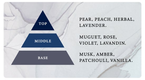 トップノートのラベンダーやハーバル、ピーチやペアなど優しく甘いフルーティな香調から、ムスクやアンバーが織りなす深みのある香りへの移り変わりは、夢へと沈んでいくような落ち着いた印象です。