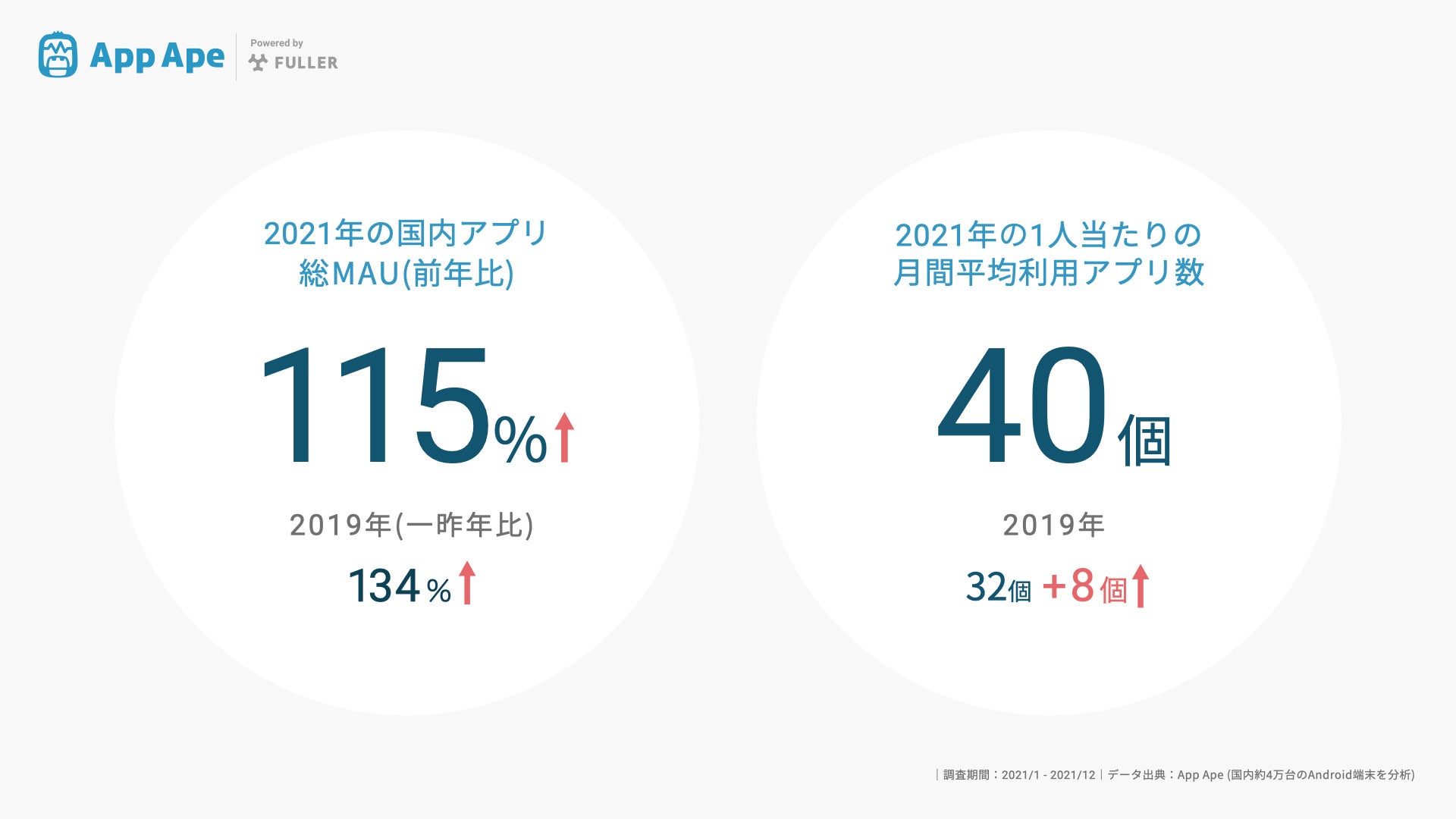 2021年の国内のアプリ総MAU(調査対象アプリの月間起動ユーザー数の合計)は、前年比115%、2019年比134%となりました。