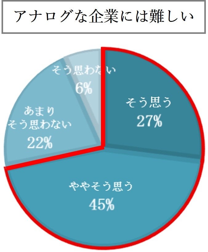 DX化についてどのようなイメージを抱いているか、各イメージ別に調査を行ったところ、約75%が「ハードルが高い」というイメージを持つと回答。また、約72%が「アナログ企業には難しい」、約64%が「自社には苦手な分野だ」というイメージを持っていることがわかりました。