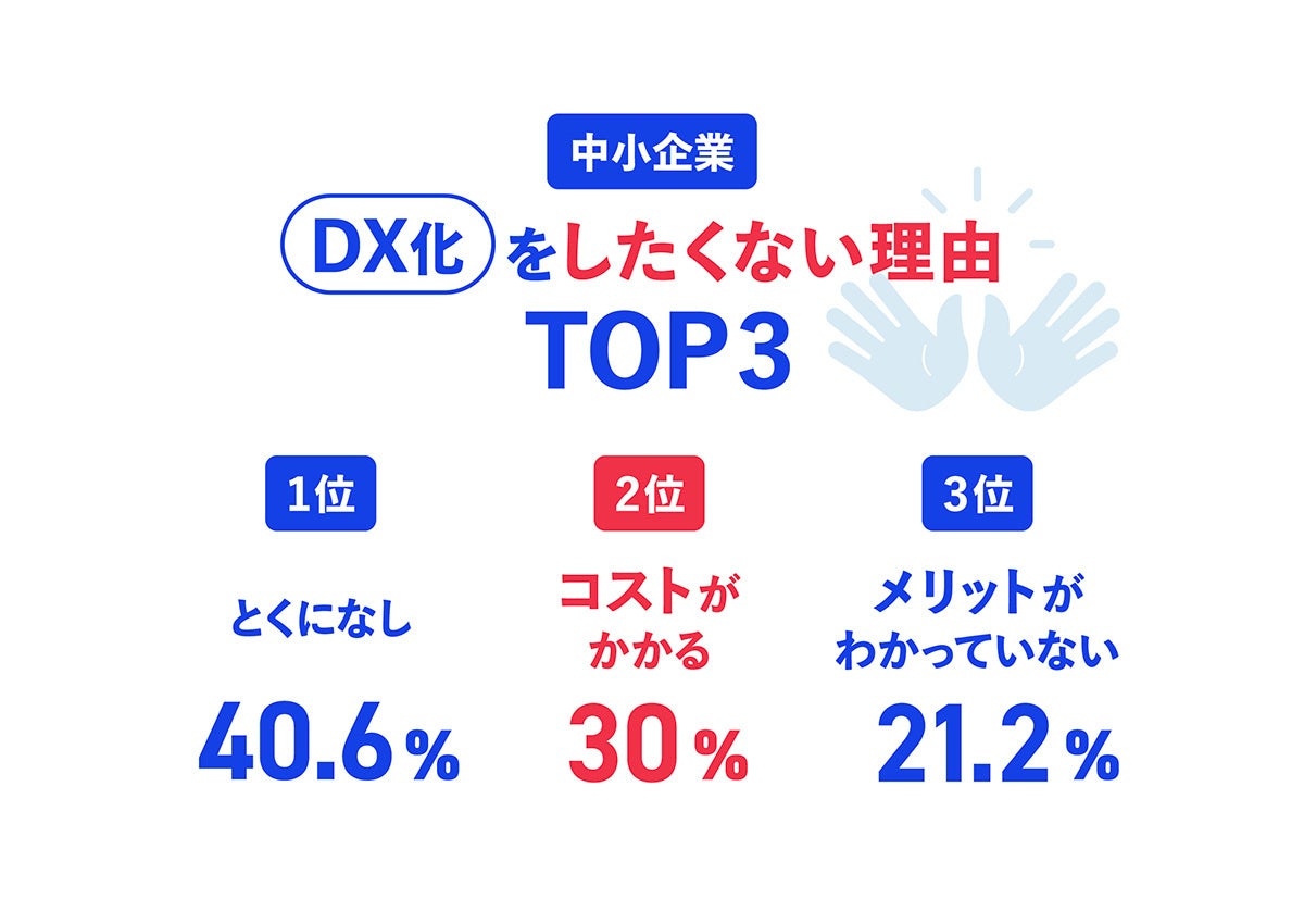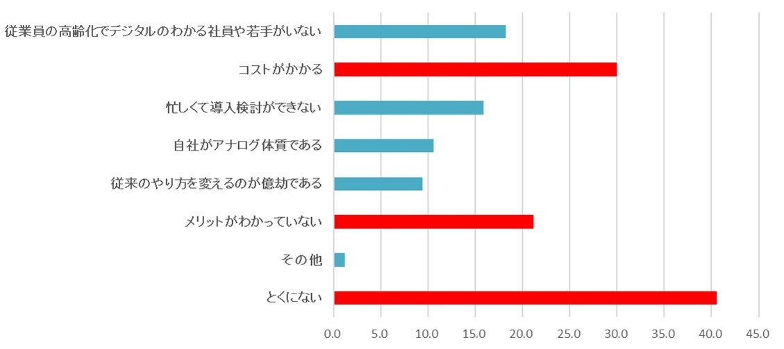 DX化に取り組む意向なしと回答した中小企業の経営者ならびに決裁者に理由を調査したところ、「とくにない(約41%)」以外の回答では、「コストがかかる」が30%と最も多く、次に「メリットがわかっていない」が約21%という結果になりました。