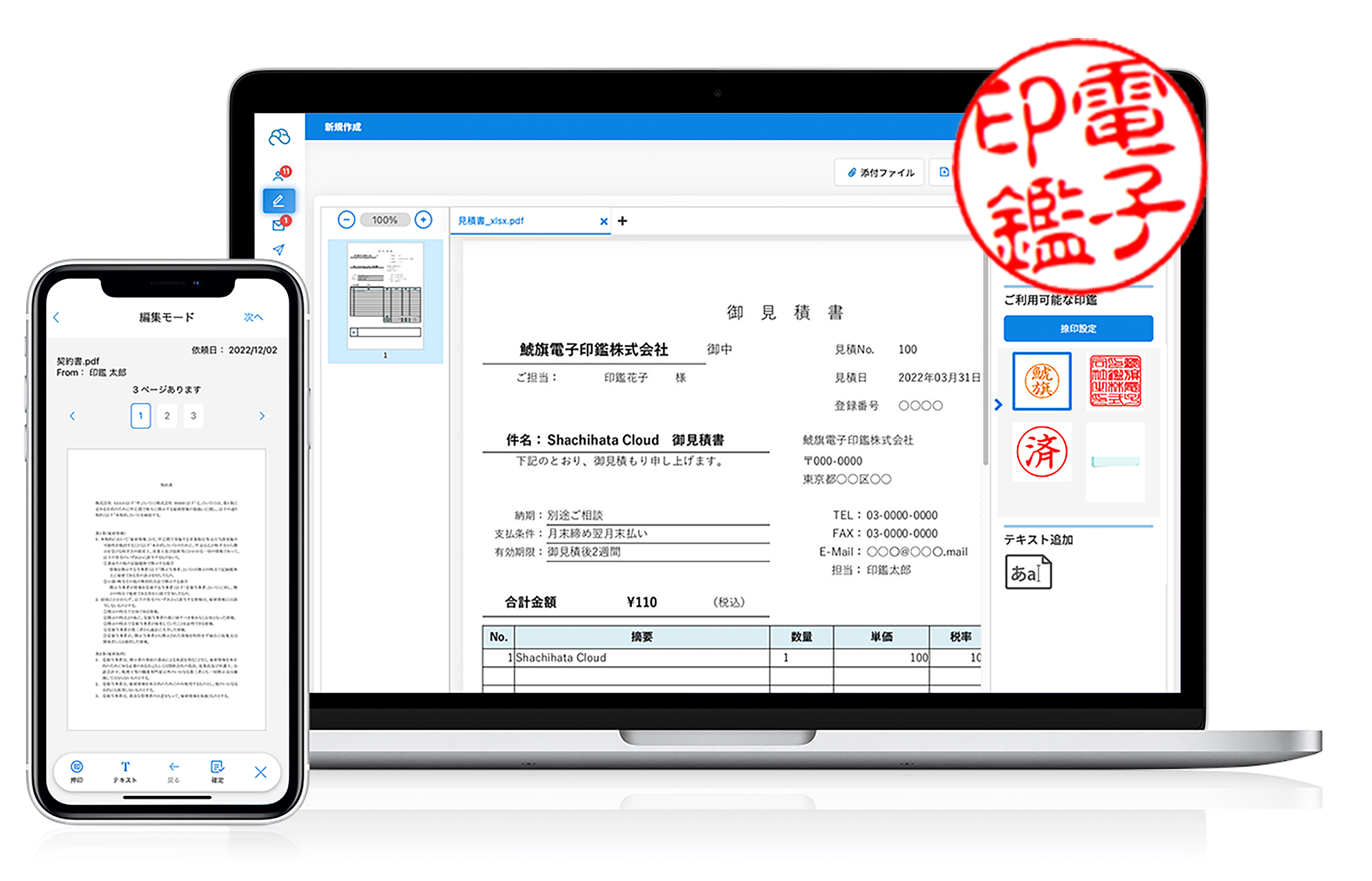 Shachihata Cloudは、リモートワーク時代のクラウド電子印鑑・電子署名サービスです。稟議書や申請書といった社内文書から、見積書や請求書、注文/請書等の取引先との決裁文書にいたるまでさまざまな文書の押印業務をデジタル化し、時間や場所を問わず簡単かつ安全に電子印鑑・電子署名を行うことができます。また、2022年には電子取引ソフトのJIIMA認証を取得しました。シヤチハタは電子印鑑システムの市場展開を1995年より行っており、導入数は2022年12月時点で101万件を突破しています。