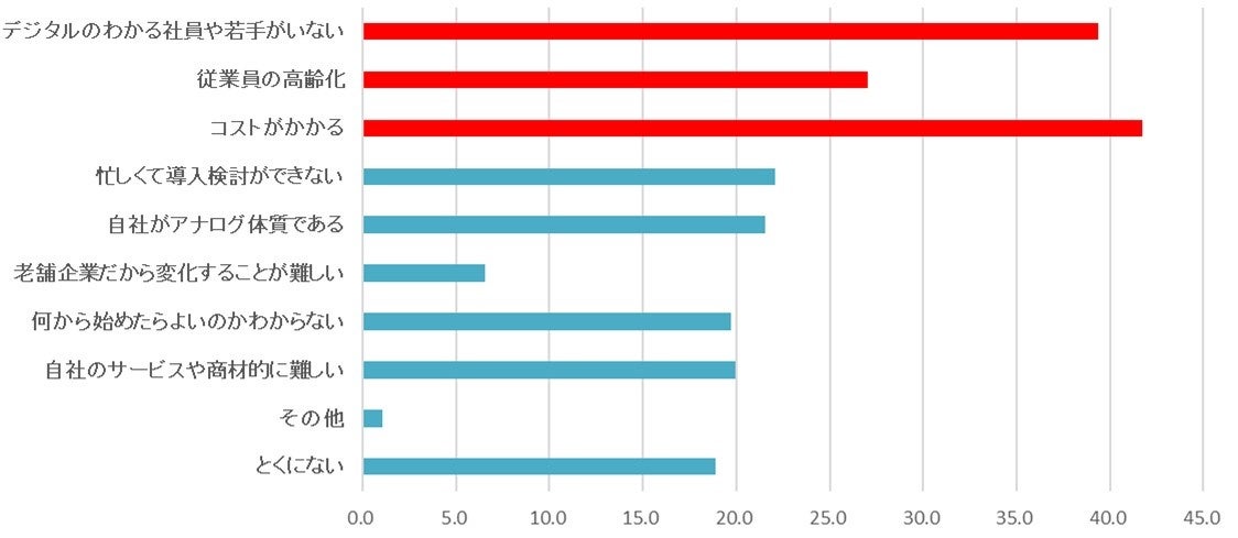 ・DX化が進まない理由1位は「コストがかかる」、続いて2位が「デジタルのわかる社員や若手がいない」、3位が「従業員の高齢化」であった。