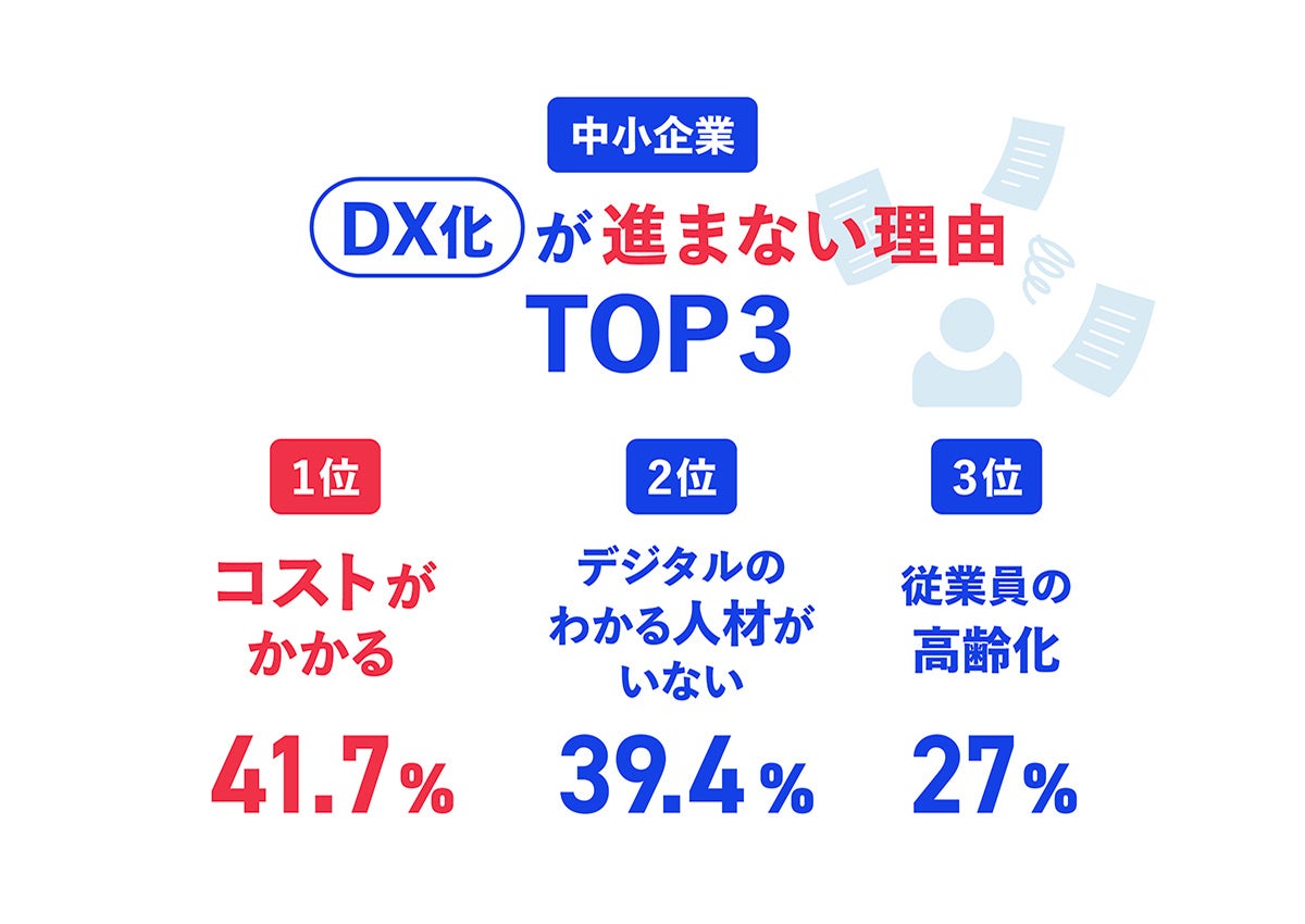 TOPIC1: 中小企業のDX化における現状について ・全社的にDX化に取り組んでいない中小企業は約76%。いまだ中小企業のDX化は進んでいない現状。 TOPIC2: 中小企業のDX化に対する理解とイメージについて ・約7割の中小企業の経営者ならびに決裁者が、「DX化」と「IT化」の違いを明確に理解していないと回答。 ・DX化に対するイメージTOP3は、1位「ハードルが高い(75.4%)」2位「アナログな企業には難しい(71.8%)」3位「自社には苦手な分野だと思う(64.2%)」。 DX化についてあまり詳しく理解していないが、DX化に対する苦手意識を少なからず抱いている傾向にあることが判明。 TOPIC3: 中小企業のDX化に対する意向について ・全社的にDX 化に取り組んでいない中小企業の経営者ならびに決裁者の55.4%と半数近くが「DX化したい」と回答。 ・DX化が進まない理由1位は「コストがかかる」、続いて2位が「デジタルのわかる社員や若手がいない」、3位が「従業員の高齢化」であった。 |