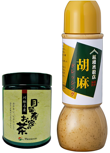 D:「胡麻ドレッシング」390ml×1本+「目留寿家のお茶」100g×2缶(前回から変更なし)