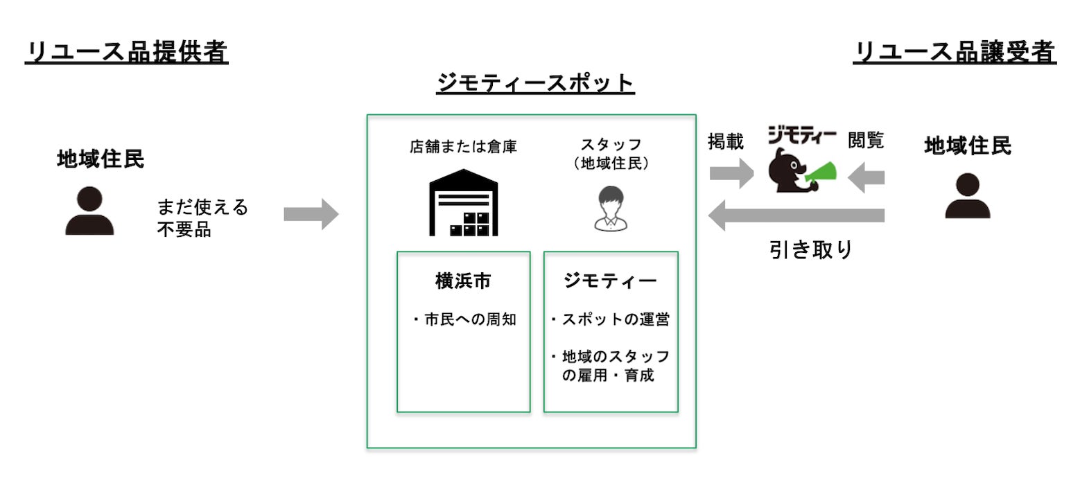 ジモティースポットは、「不要になったけれどもまだ使えるモノ」を地域のコミュニティ内で有償または無償で譲り合うことが出来るサービスです。持ち込み希望の方は、ジモティースポットに持ち込むだけで、手軽に必要とする人に譲渡することができます。そして、譲り受け希望の方は、持ち込まれたモノの情報をジモティーで検索し、ジモティースポットで引き取ることでマッチングが成立する仕組みとなっています。