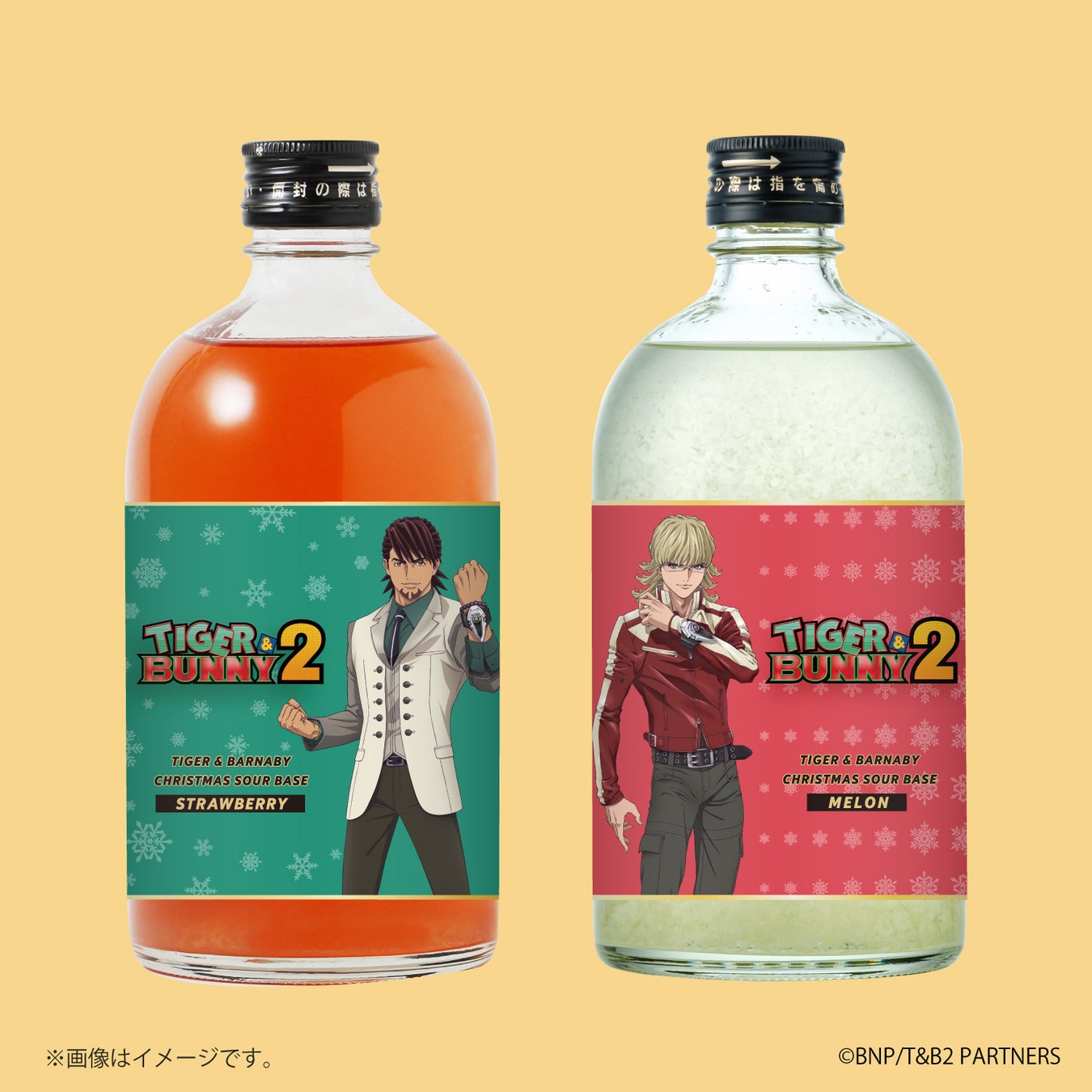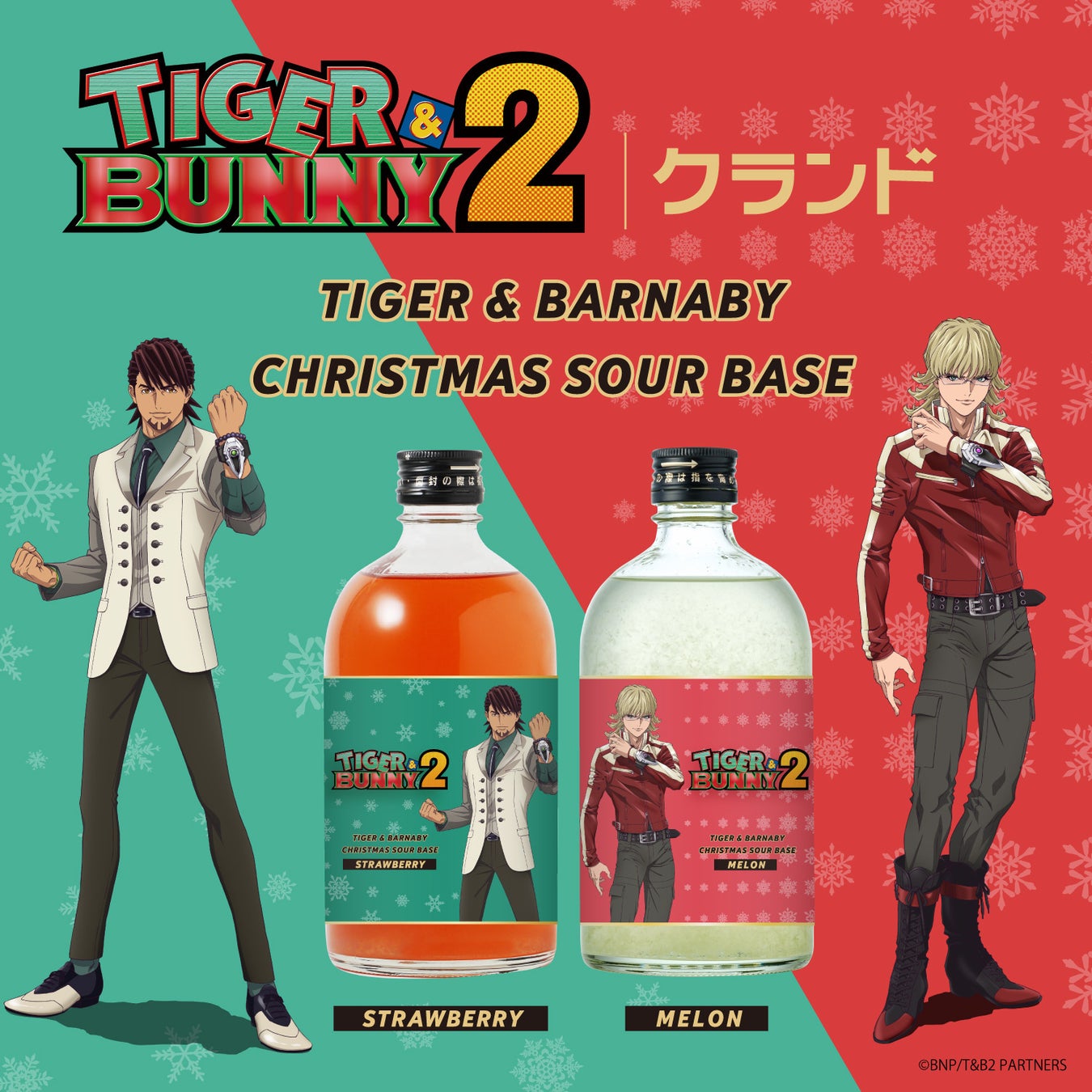 「TIGER & BARNABY CHRISTMAS SOUR BASE」は、アニメ『TIGER & BUNNY 2』とのコラボ第二弾で誕生した、オリジナルラベルのプレミアムなサワーベースです。クリスマスに合わせて、虎徹とバーナビーの2人をそれぞれイメージしました。