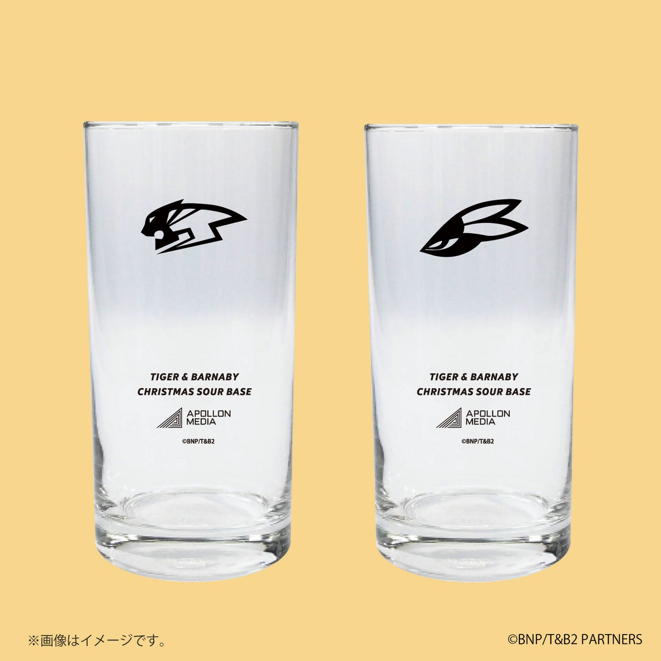 ワイルドタイガー、バーナビーそれぞれのヒーローマーク入りのサワーグラスです。氷が入ったグラスに「TIGER & BARNABY CHRISTMAS SOUR BASE」を入れ、炭酸水を注いだら、簡単にきれいなプレミアムなサワーができあがります。