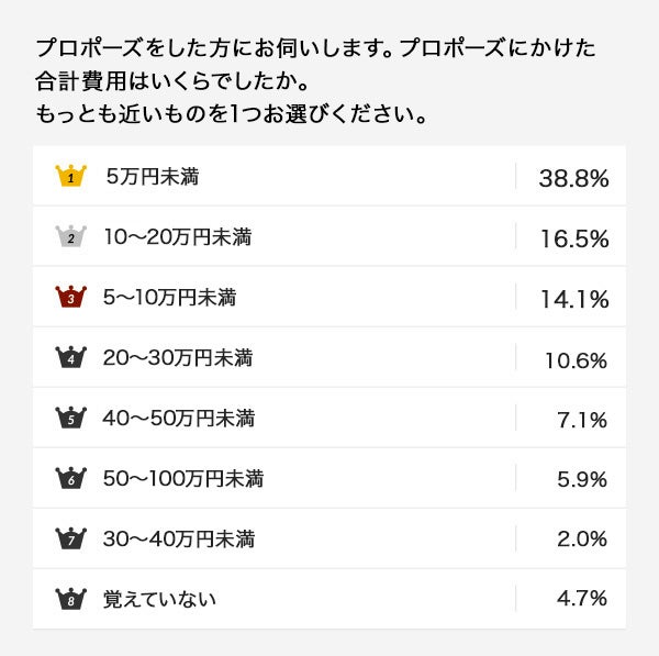 プロポーズにかけた費用は「5万円未満」が最も多い結果に