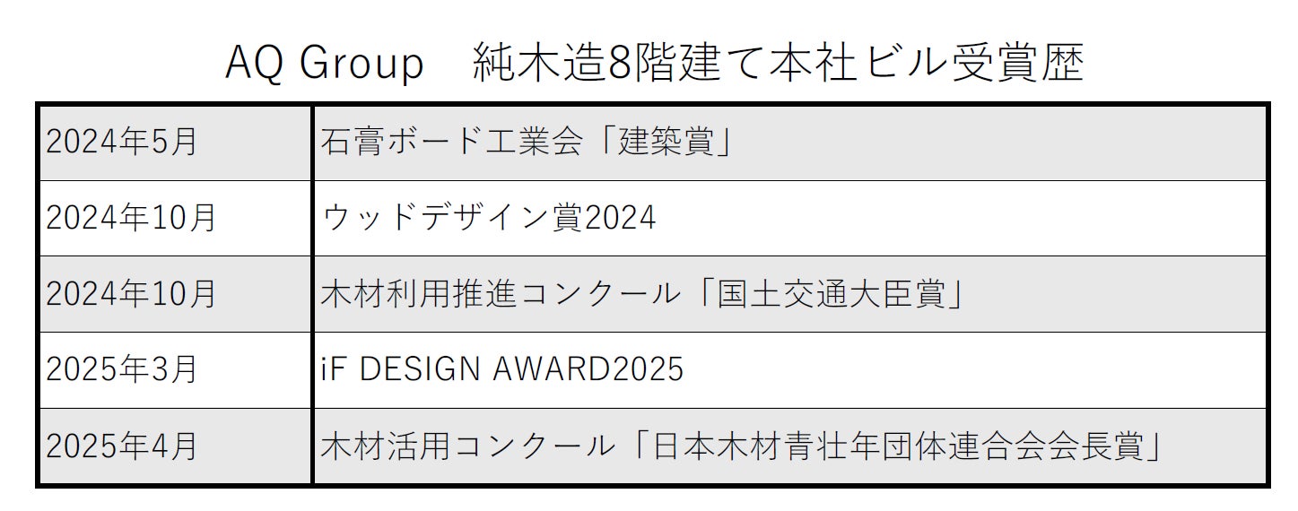 木造建築の可能性を拡げるAQ Group純木造8階建て本社ビル 「木材活用コンクール優秀賞」受賞で5つ目のタイトル獲得!