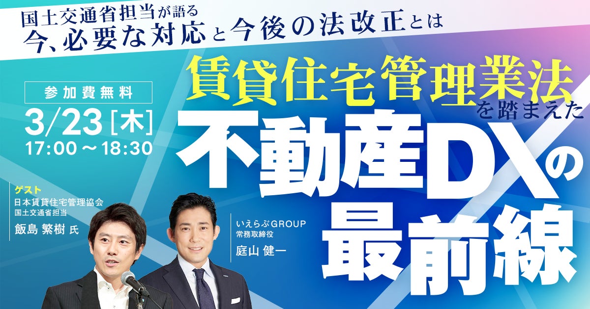 株式会社いえらぶGROUP(本社:東京都新宿区、代表者:岩名泰介、以下「いえらぶGROUP」)が3月23日(木)に開催する賃貸管理会社の担当者向けセミナー「賃貸住宅管理業法を踏まえた不動産DXの最前線」の特別ゲストが、公益財団法人日本賃貸住宅管理協会(本部:東京都千代田区、会長:塩見紀昭、以下「日管協」)事務局次長 飯島繁樹 氏に決定したのでお知らせいたします。