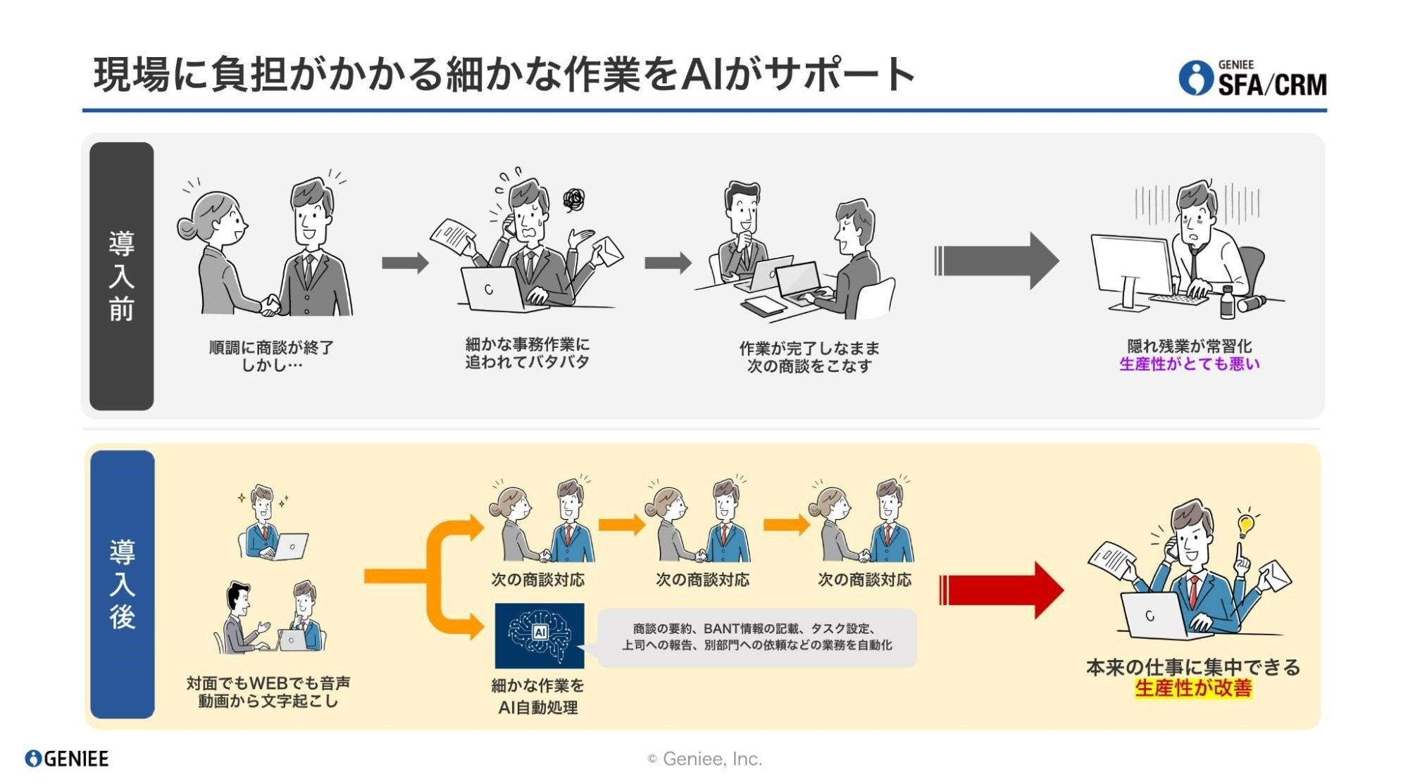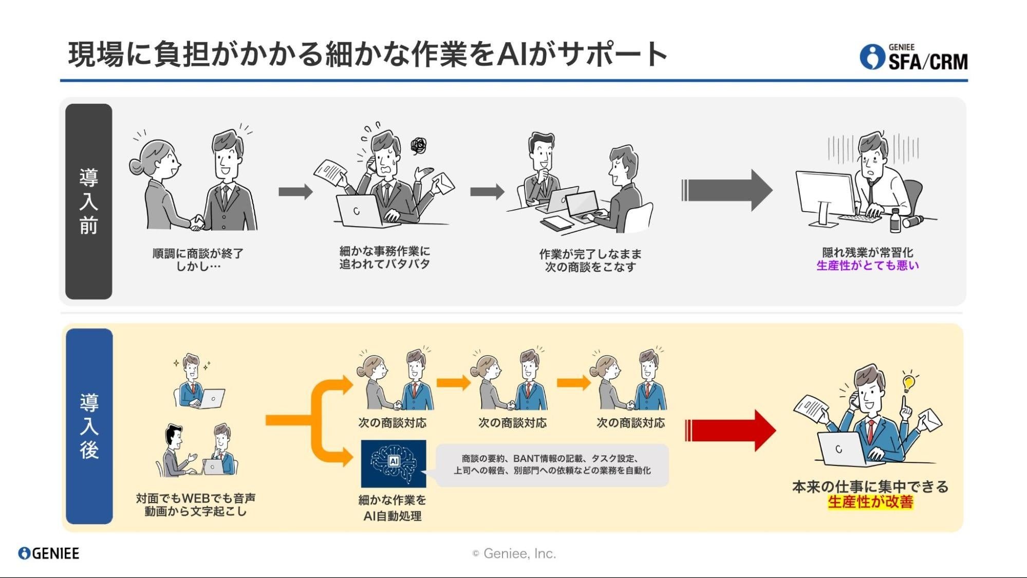 【業界初※】ジーニー、「GENIEE SFA/CRM」で商談の議事録作成からSFA/CRMへの情報登録を自動化