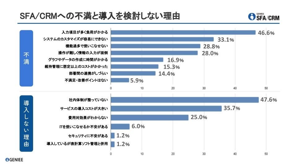 ジーニーが339名の国内企業の経営者・営業担当者に対して実施した営業活動の状況に関するアンケート調査によると、SFA/CRM導入への不満及び導入の検討をしない理由として、入力に対する負荷がある実態や導入後の活用について社内体制の整備に課題があることがわかりました。