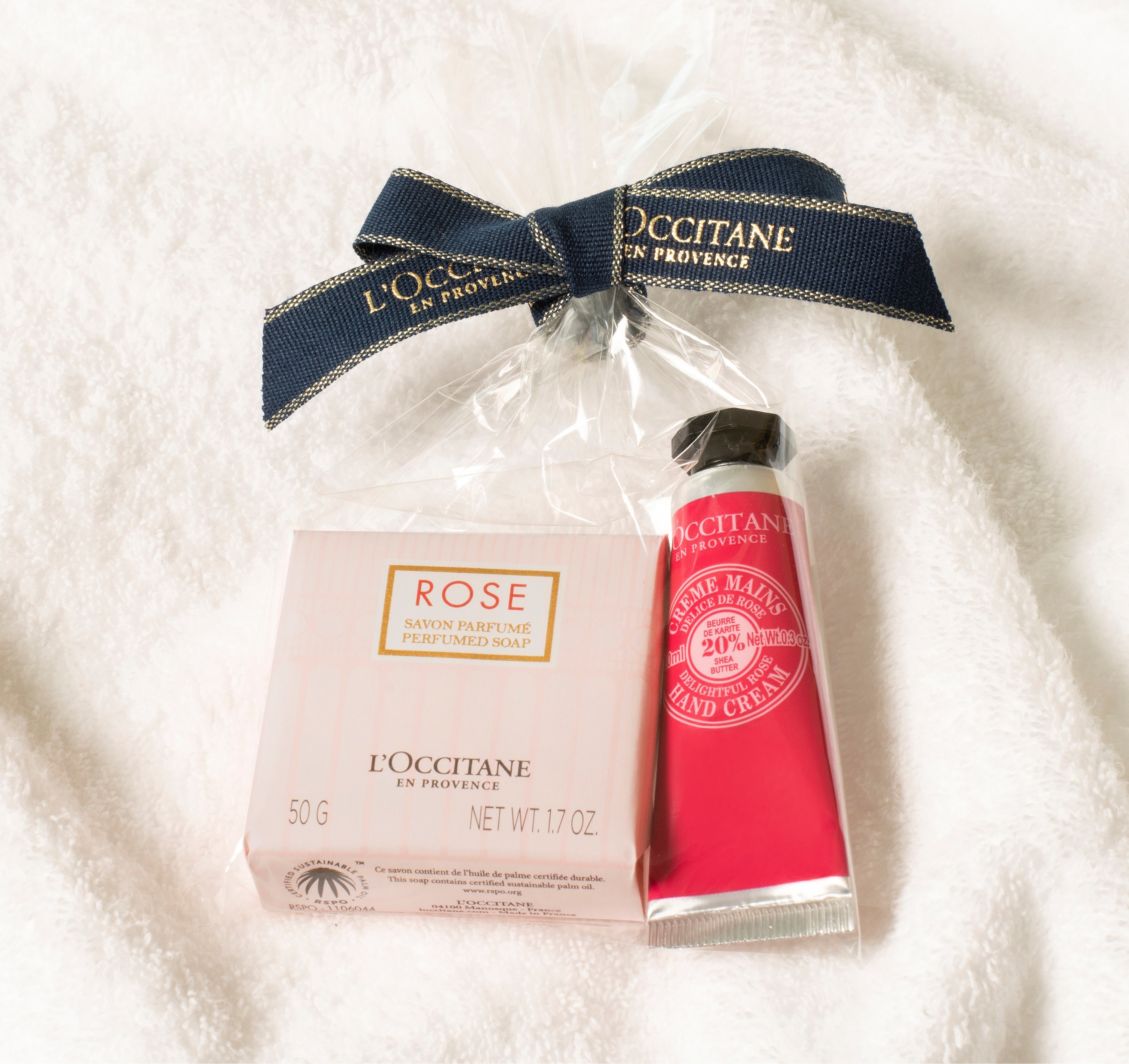 ご宿泊時に、フレッシュで高品質なローズウォーターを使用したロクシタンのローズソープとハンドクリームのプチギフトセットをプレゼント。