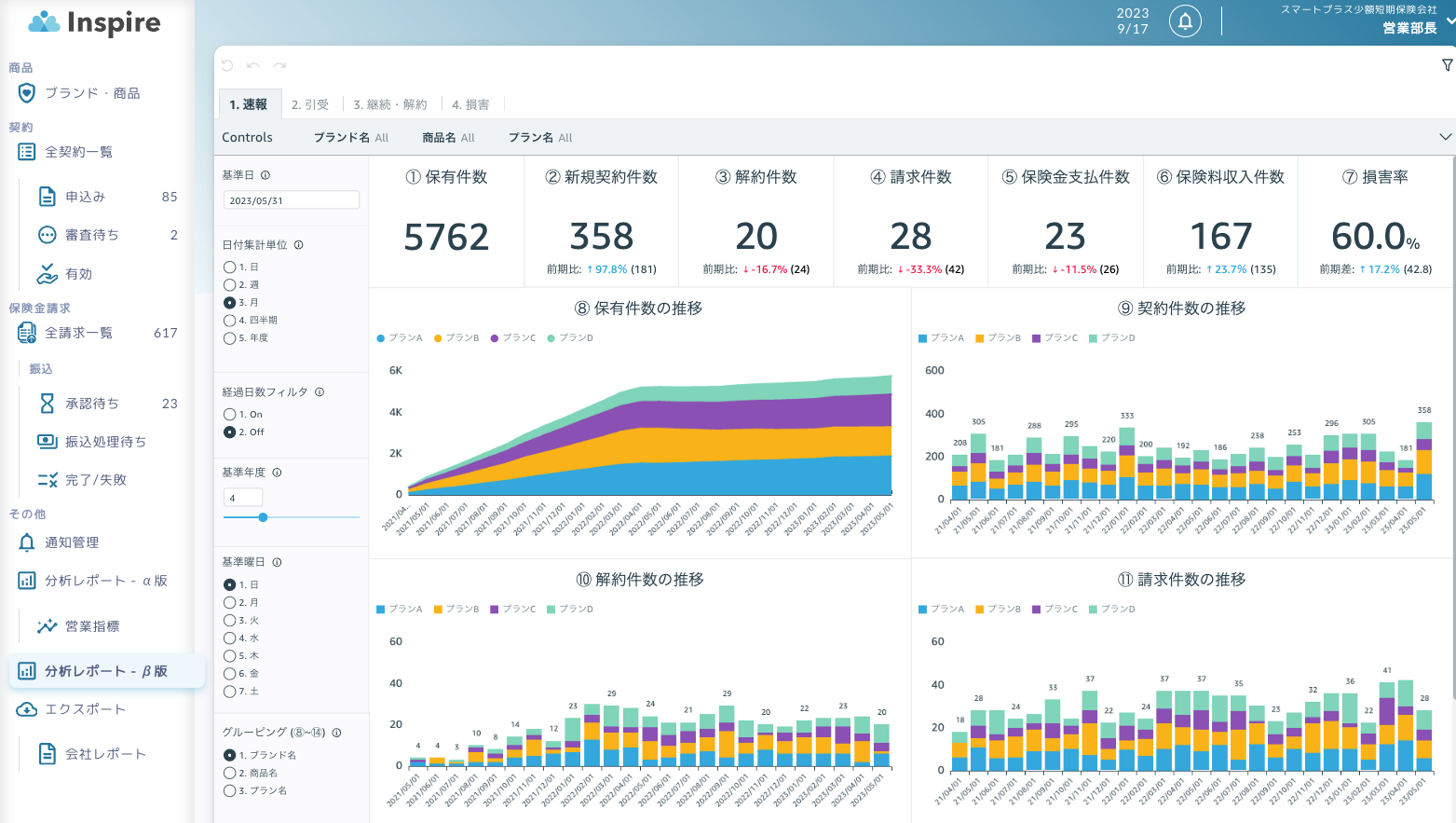 データ分析の初心者から上級者まで使えるデータ分析機能です。「Inspire」の管理コンソールの一機能として提供します。保有件数、新規契約件数、解約件数など20項目以上の数値をグラフで一覧できるほか、集計単位や基準日を変更したり、ブランド名や商品名でグルーピングしたりして詳細な分析をすることも可能です。利用を希望する企業向けに2023年内に「分析レポート(β版)」として提供し、フィードバックを得ながらより使いやすく改良していきます。