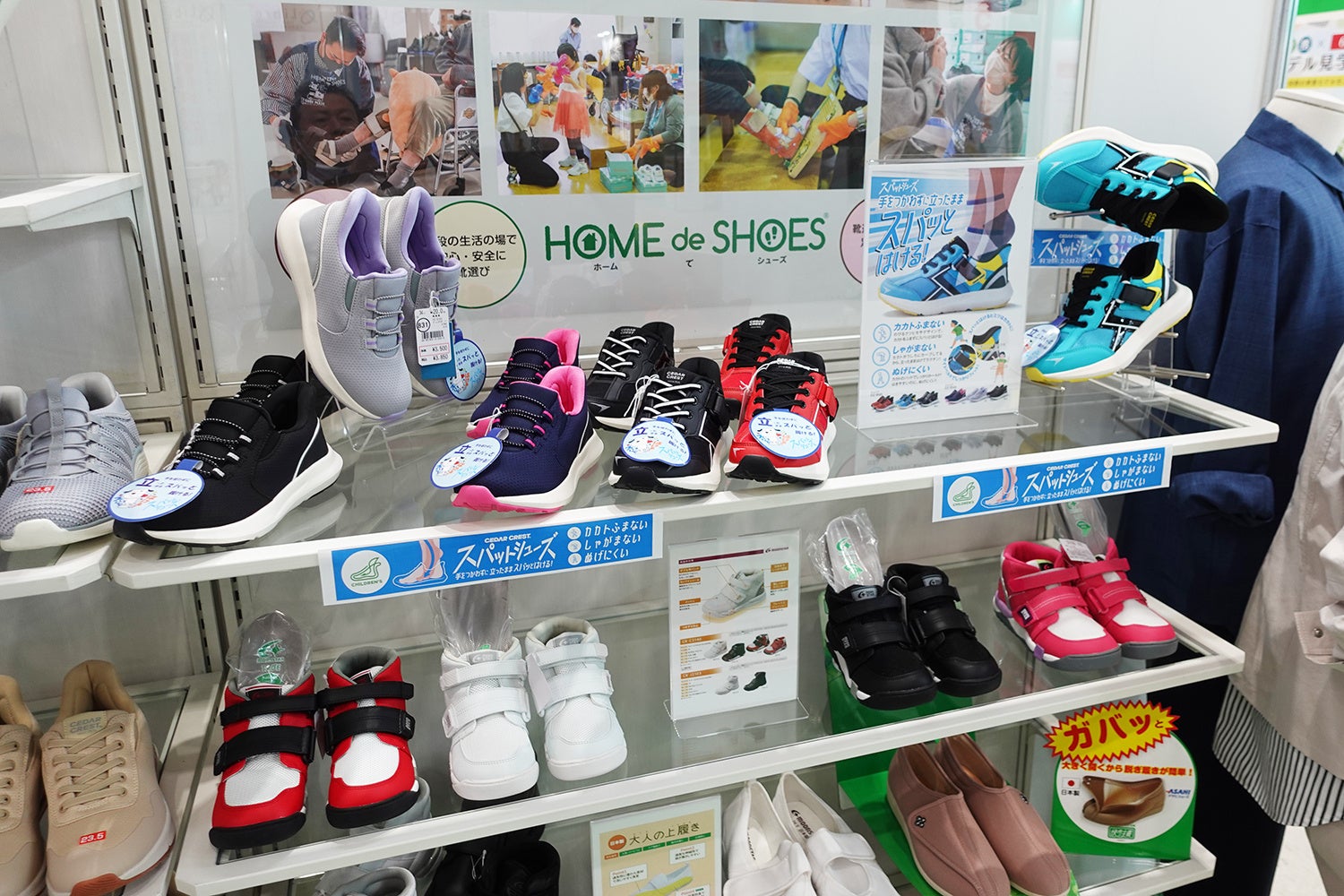 全国の「東京靴流通センター」「シュープラザ」店舗が、障害者支援施設や老人ホームなどの社会福祉施設で実施する靴の訪問販売サービス「HOME de SHOES(ホームでシューズ)」で2023年に続き2回目の出展です。『靴選びのプロ』である当社スタッフが足の計測やフィッティングを行い、施設利用者の皆様にとって身体の一部ともいえる「靴」をお選びするこのサービスは、利用者の安全面のケアや施設スタッフの靴の購入に関する負担軽減につながると高い評価をいただいております。