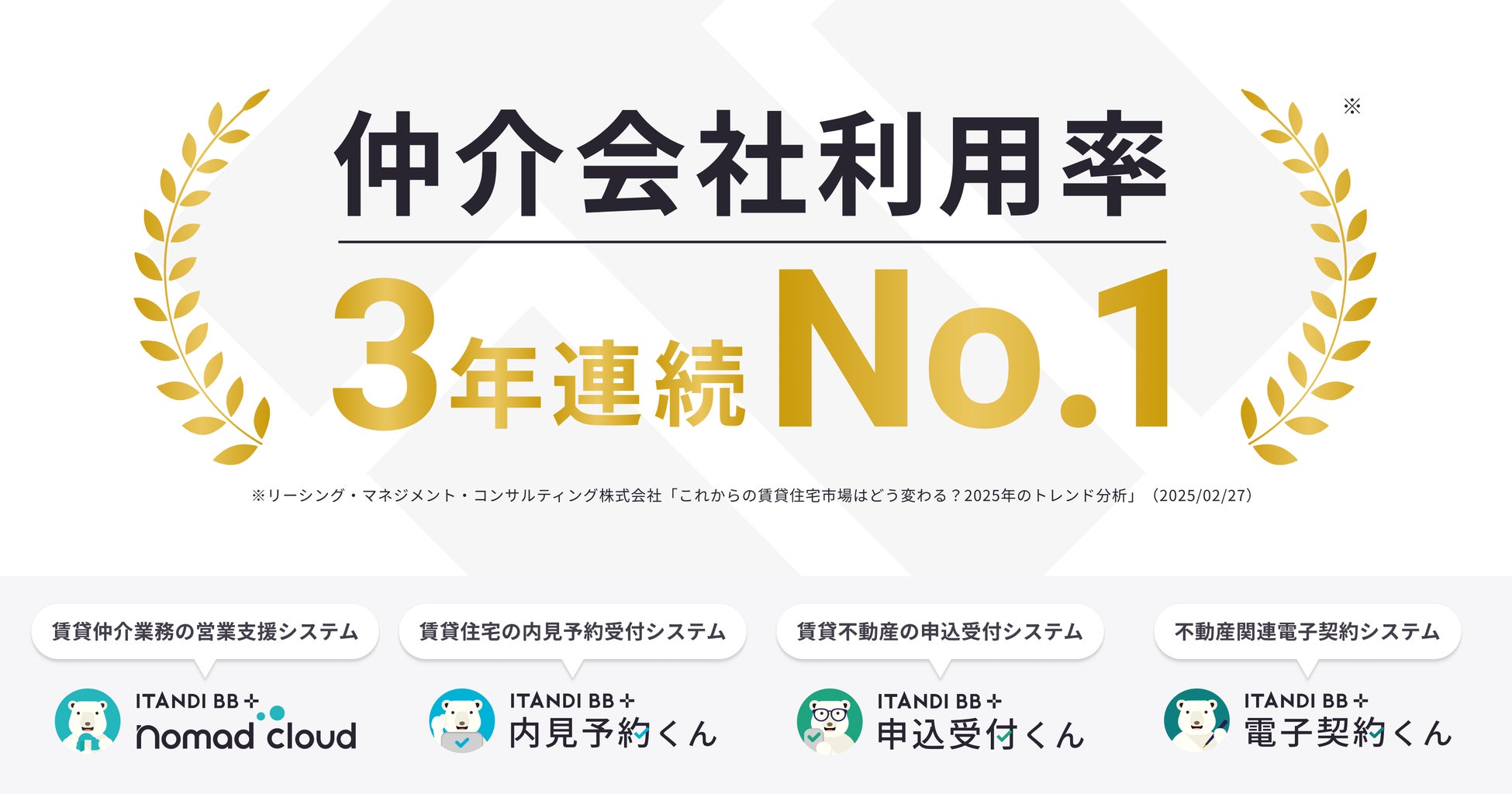 テクノロジーで不動産取引をなめらかにするイタンジ株式会社は、リーシング・マネジメント・コンサルティング株式会社が行った調査「これからの賃貸住宅市場はどう変わる?2025年のトレンド分析」において、「内⾒予約くん」「申込受付くん」「電⼦契約くん」「ノマドクラウド」の4サービスで、3年連続賃貸不動産仲介会社の利⽤率No.1を獲得しました。