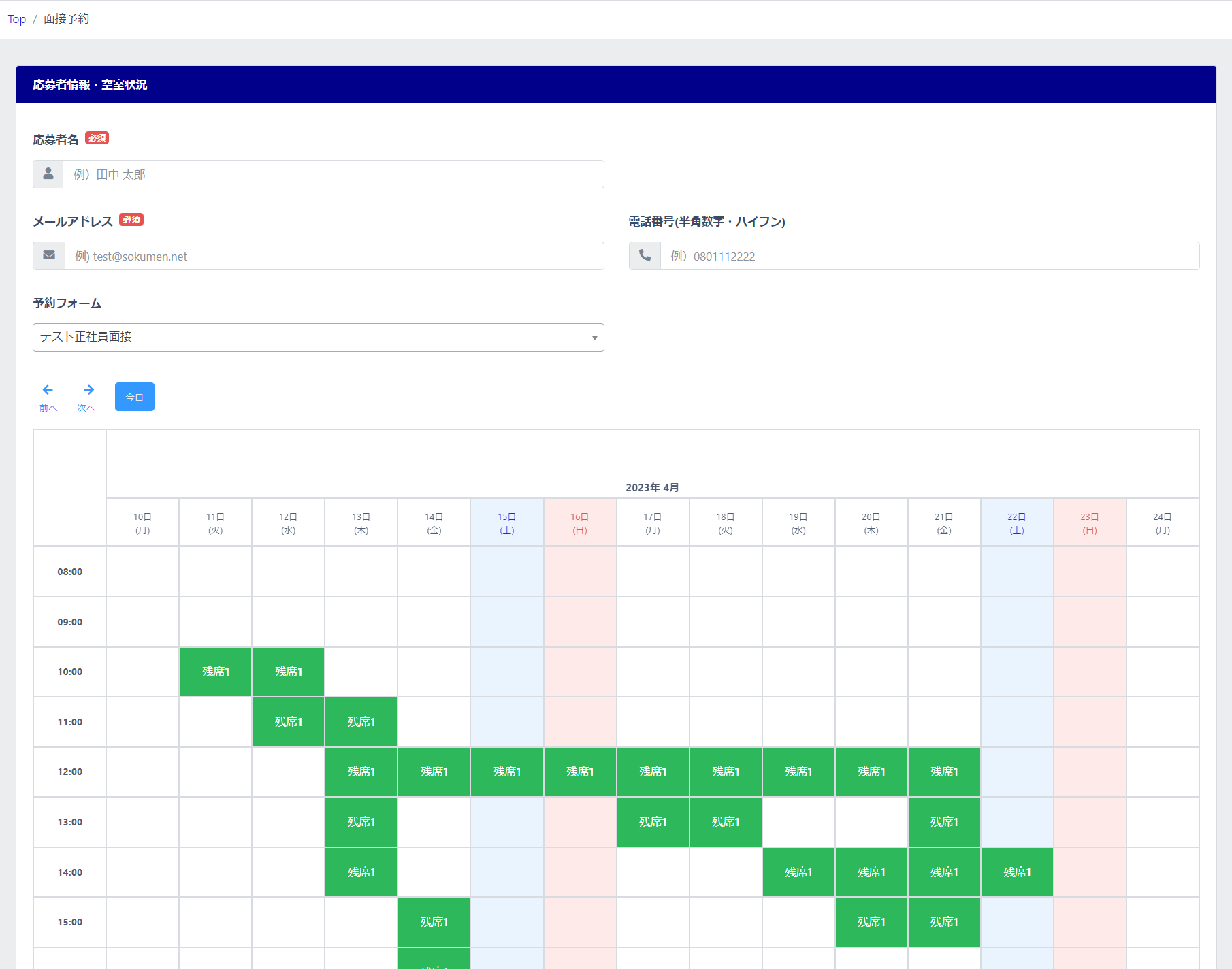 SOKUMENのオンライン日程調整は応募者との面接スケジュール調整を自動で行う機能ですが、今回実装した機能は面接予約担当者と面接官が別の場合や受付担当のコールセンターがある場合に管理画面から面接空き枠状況を確認しながら予約登録を行えるようにするものです。この機能追加により空き枠を確認するために別のページでカレンダーを開いてスケジュールを確認する必要がなくなり受付担当の負担も軽減されます。