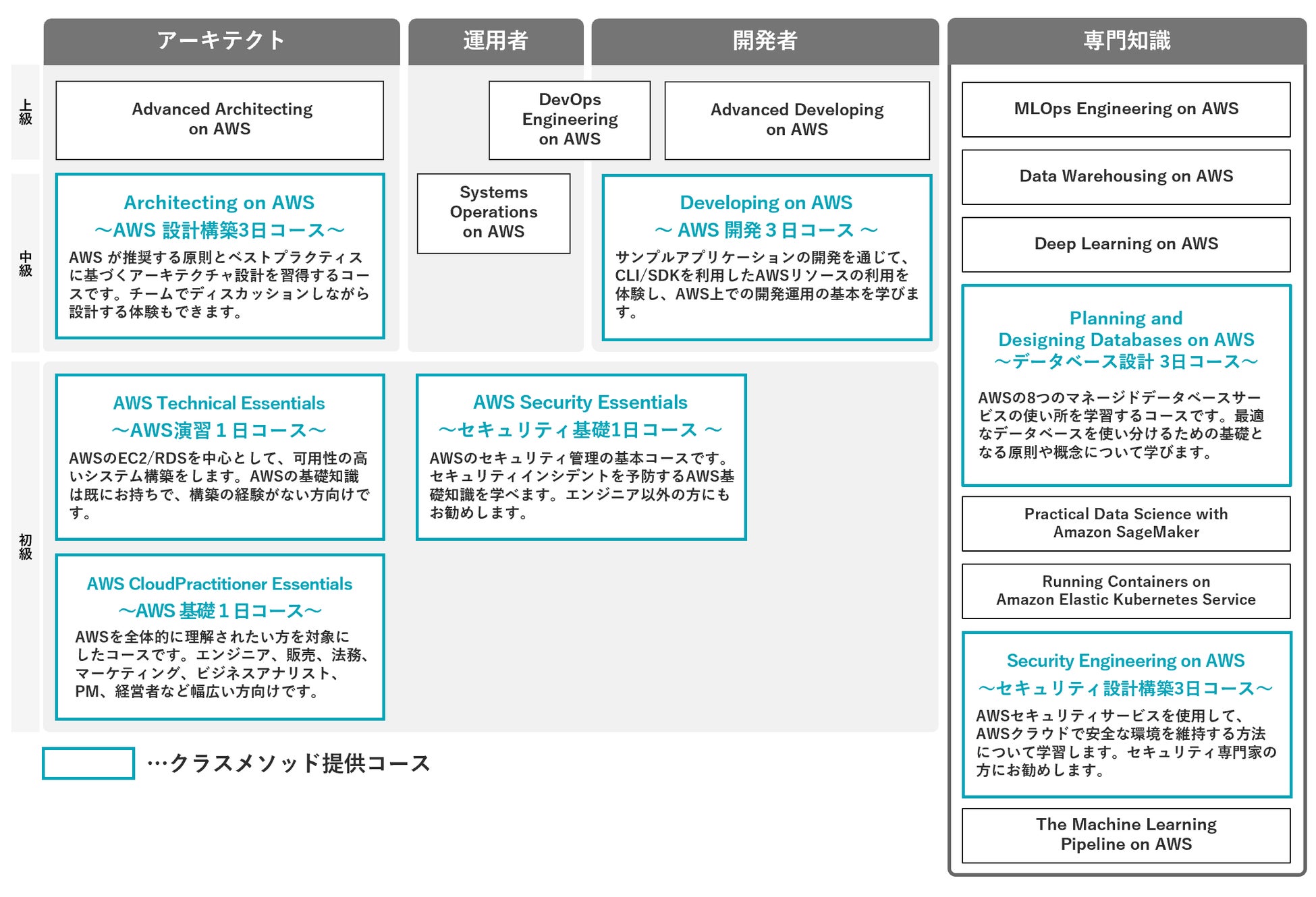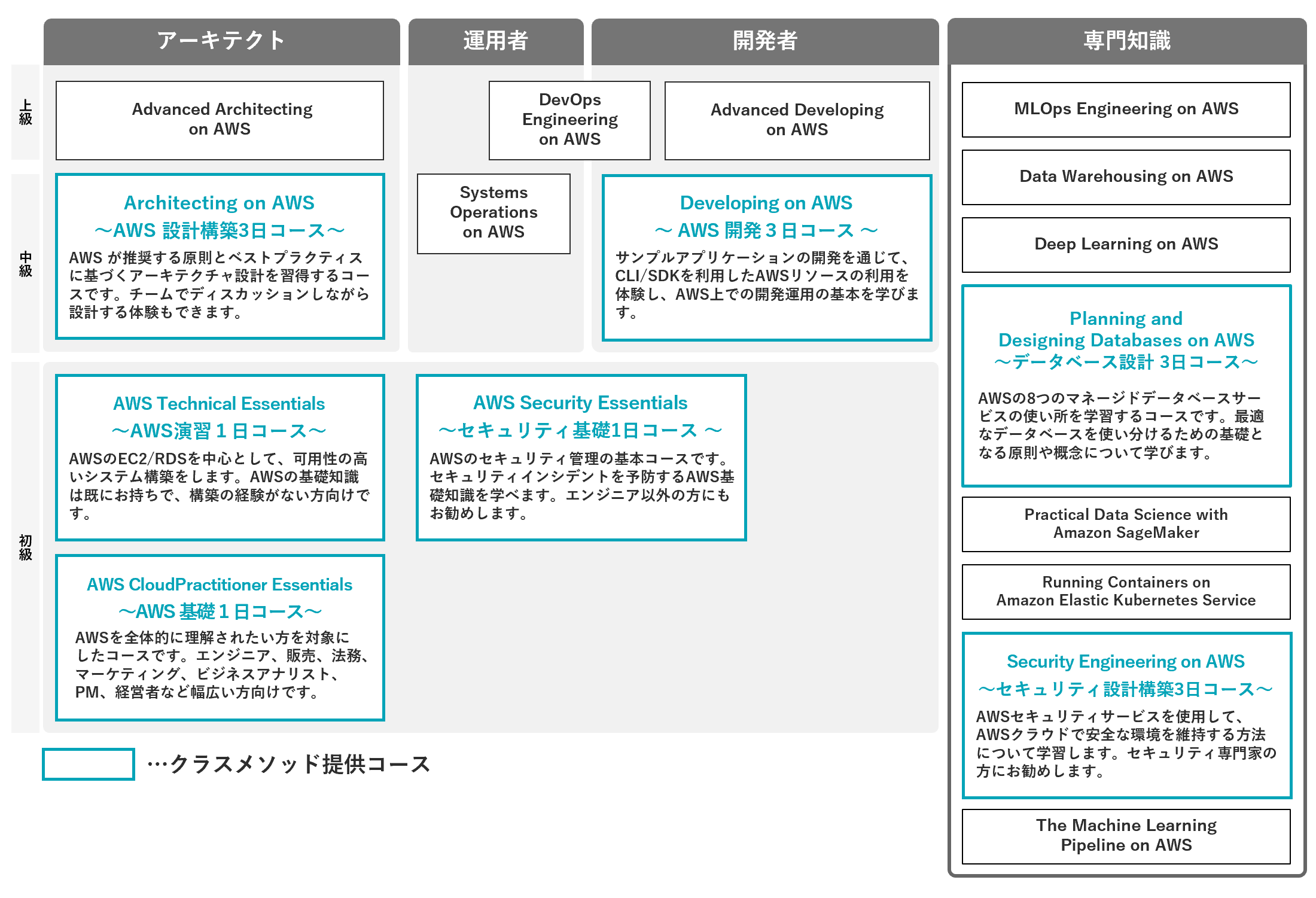 クラスメソッドでは、長年AWS支援に携わってきたエンジニアがAWS認定インストラクターの資格を取得し、日本国内における固有の環境や実務をふまえた実践的なコースを提供します。クラスメソッドは、2019年7月に同認定を取得し、現在は基礎コースから専門コースを含むセキュリティまで全7コースを提供しています。