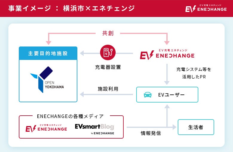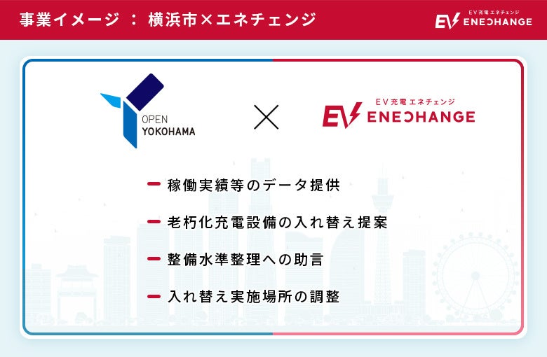 エネチェンジは横浜市の公共施設に対し、導入台数No.1(※)の6kW普通充電設備であるEV充電エネチェンジを導入してまいります。また、EVユーザーの利便性向上に役立つ取り組みや充電システムを活用した横浜市の施策について、エネチェンジが運営する各種メディアを通じて協働でPRを行い、市のEVシフトを推進します。