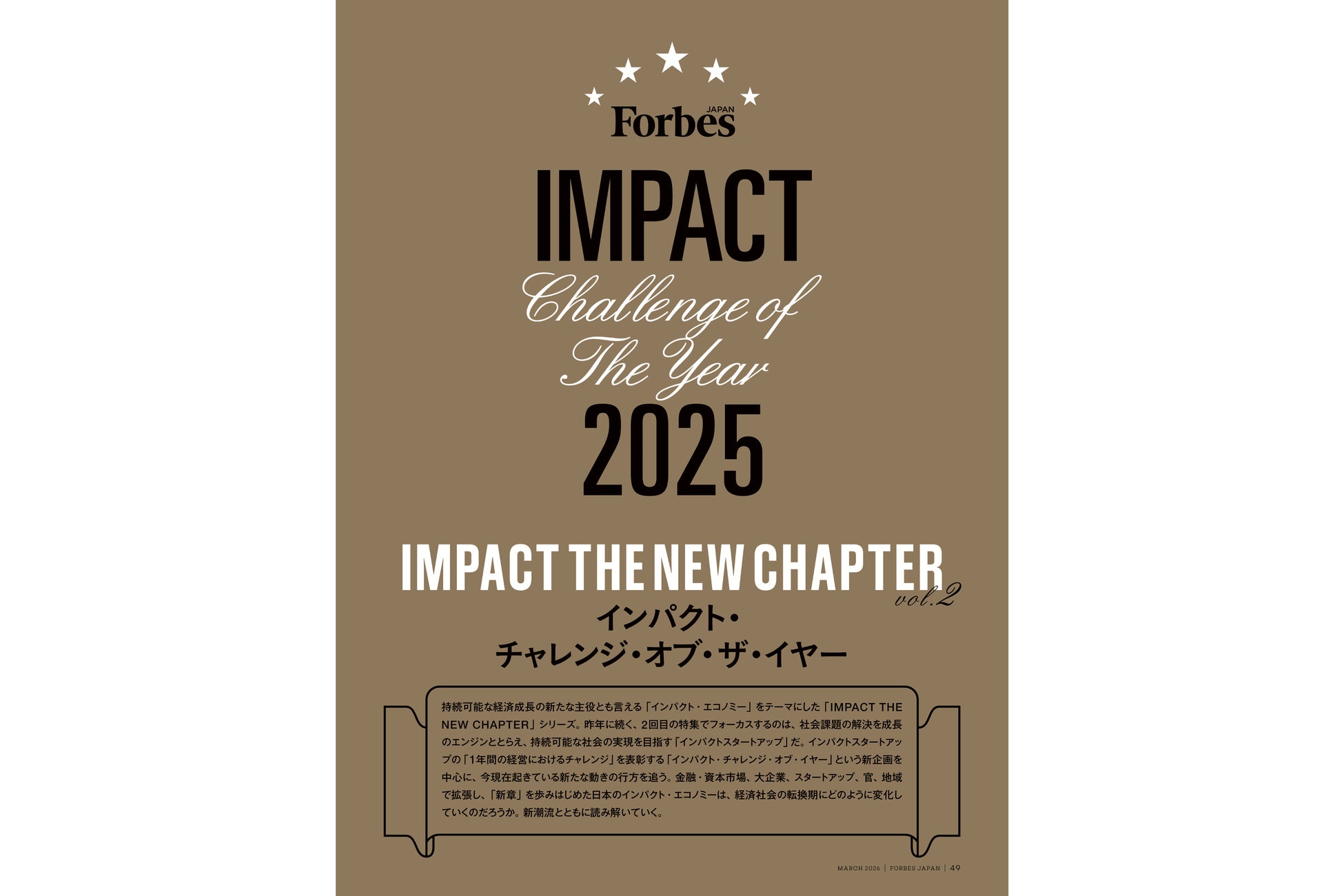 また、持続可能な経済成長の新しい主役とも言われる「インパクト・エコノミー」のなかでも、経済性と社会課題解決の両立で世界を変えようとしているインパクトスタートアップに注目。新企画として、経営のチャレンジを表彰する「インパクト・チャレンジ・オブ・イヤー2025」を開催。日本のインパクト・エコノミーの新潮流を読み解いていきます。