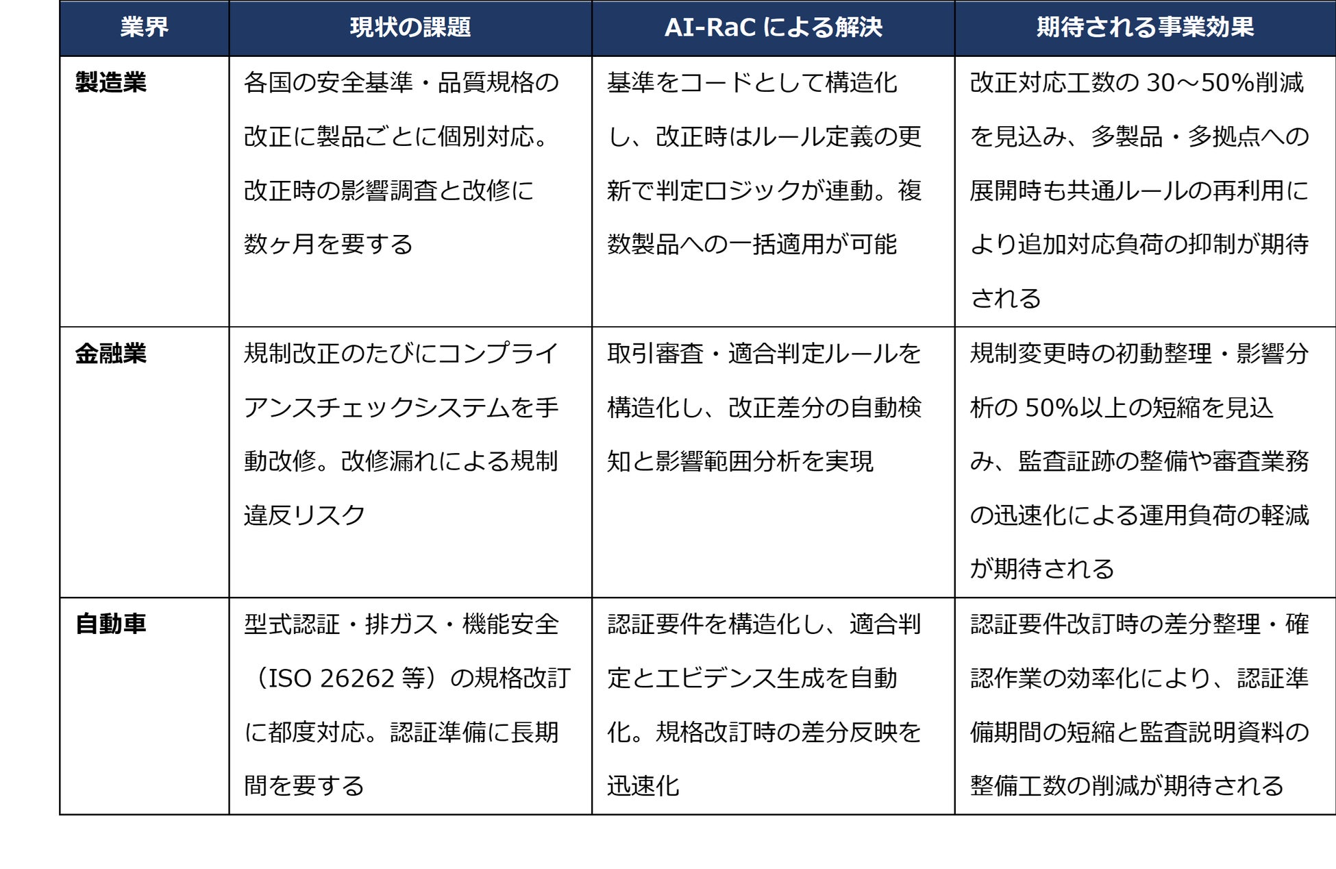 このような環境変化の中で、企業に求められるのは、法改正のたびにゼロから対応することではなく、ルールそのものを構造化し、変更時の影響分析や反映を再利用可能な形で進められる基盤を持つことです。AI-RaCは、規制対応コストの圧縮にとどまらず、将来的にはAIエージェントが安全かつ一貫性を持って動くための判断ルール基盤となることを目指しています。