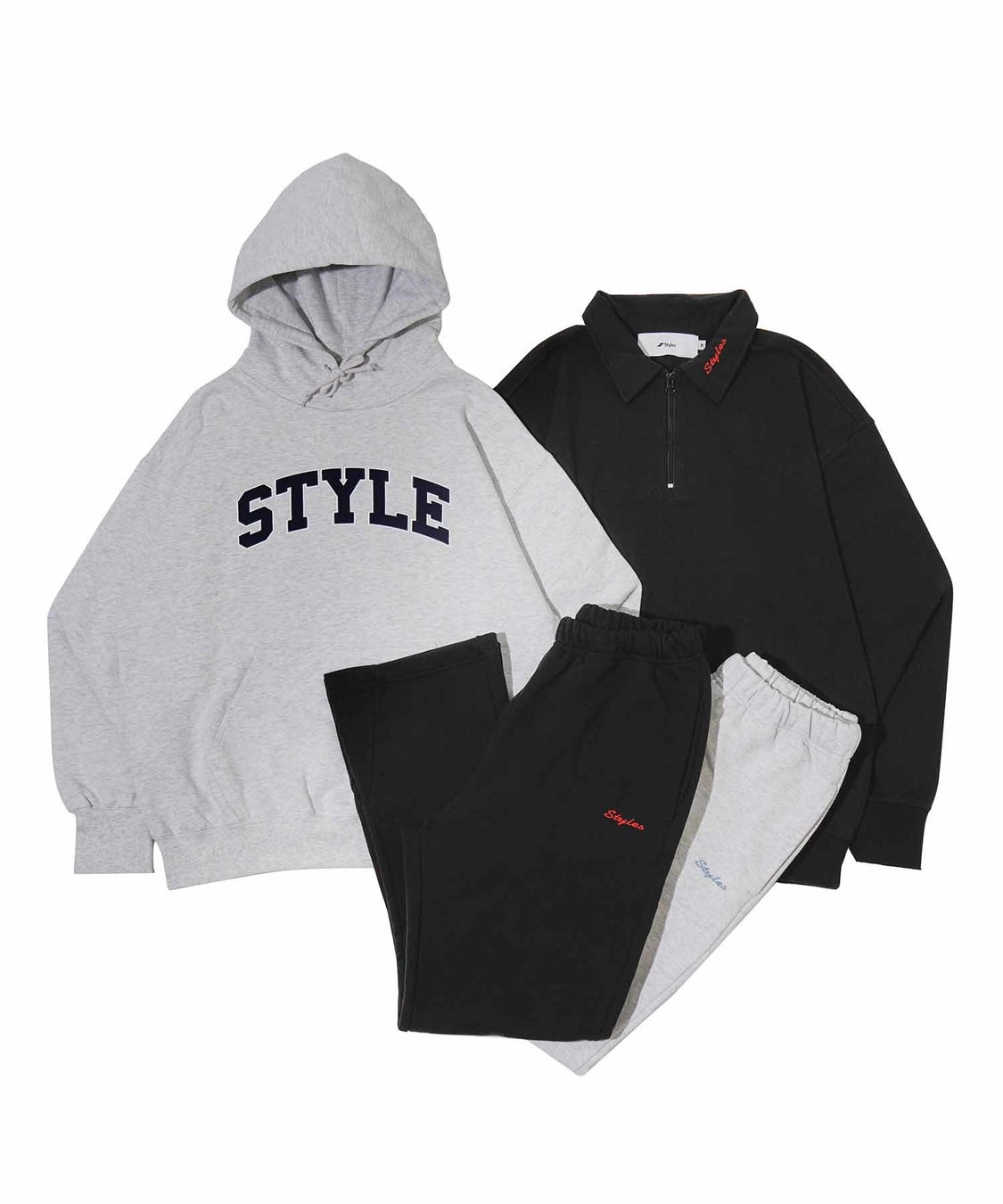 本シリーズは、シルエットとデザインに拘ったプルオーバーフーディ、"フットウェアをさらにカッコよく"をコンセプトに仕上げたスウェットパンツ、襟にStylesのロゴ刺繍があしらわれたハーフジップスウェットをラインナップ。ベーシックの「GREY」と「BLACK」の2カラーをチョイスし、ユニセックスサイズの展開となります。