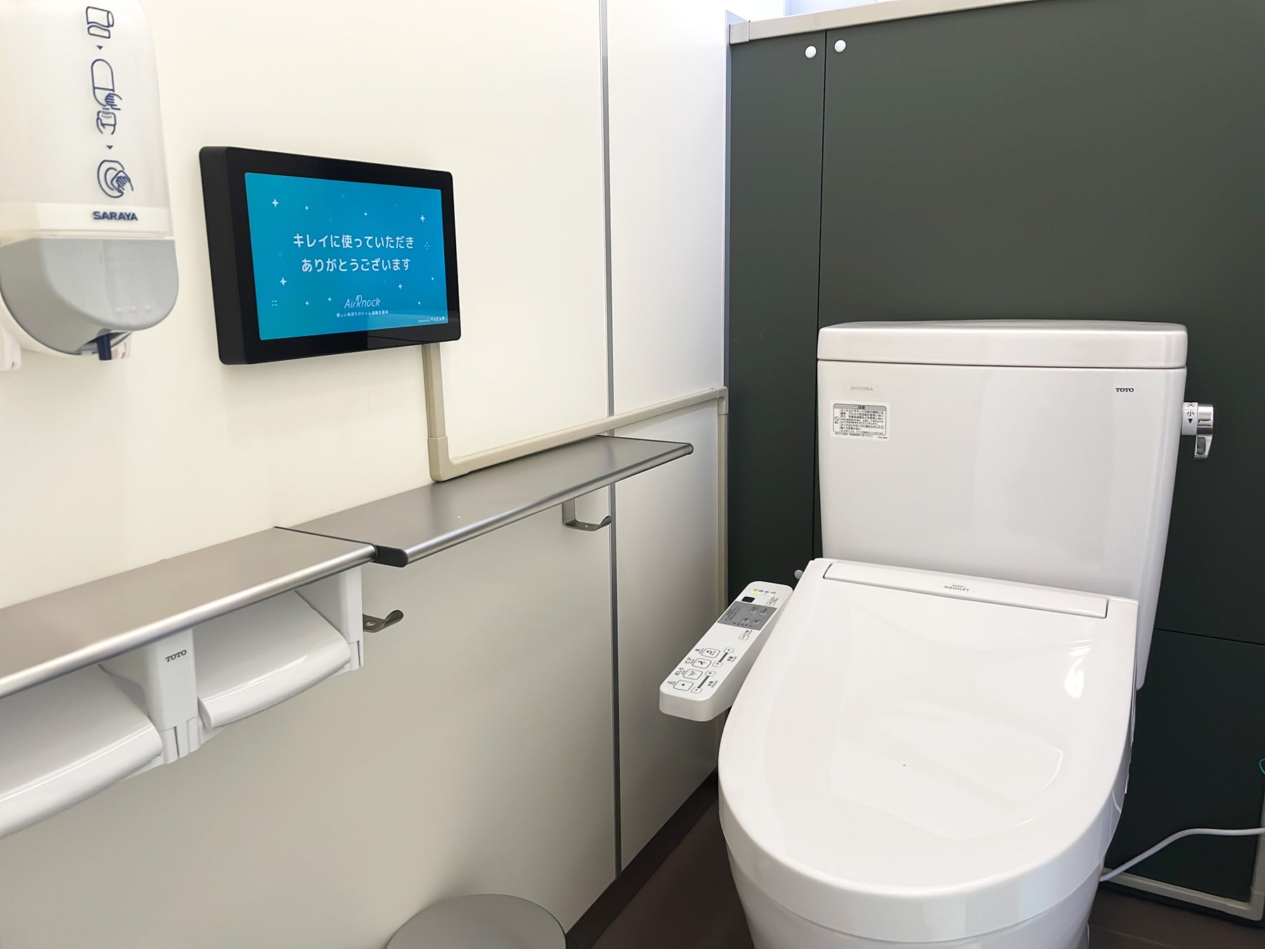・トイレ空間のメディア化:個室内に設置されたサイネージを活用し、動画を放映することで利用者への施設案内や広告放映による収益化が可能となります。またトイレを情報配信面として利用できるようになります。