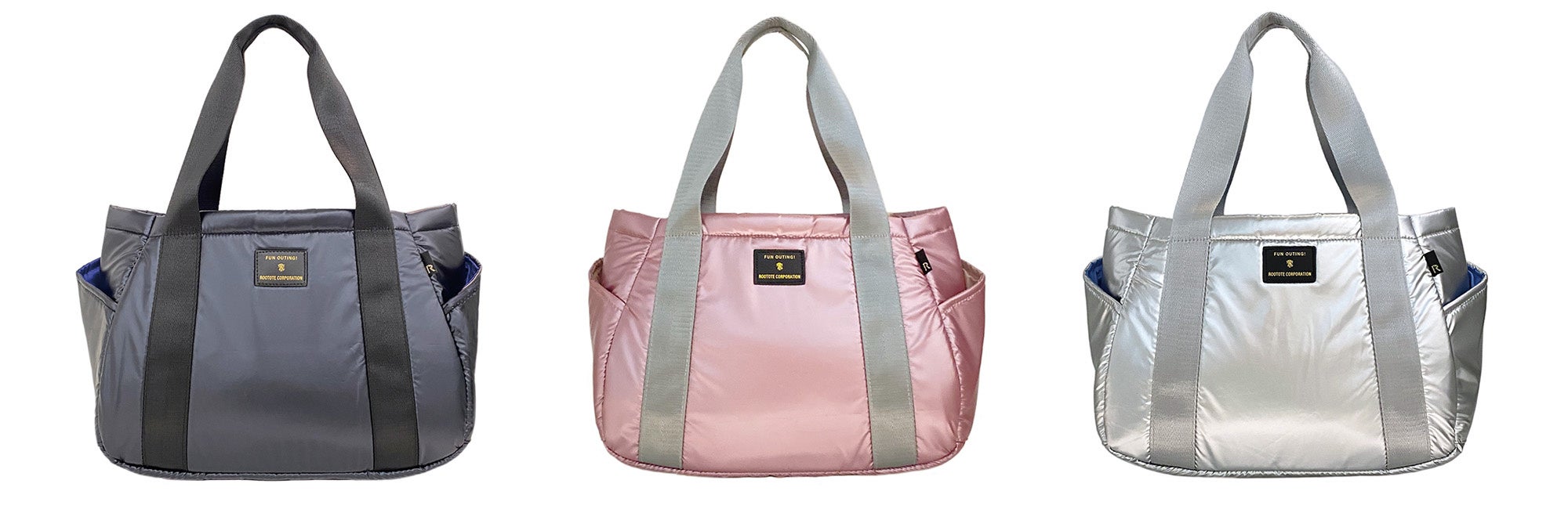 LT.デリ.パルーティ.Shiny-A 5,280円(1458 01 BLACK、02 PINK、03 SILVER)サイズ:W32×H23×D14cm 持ち手:38cm 素材:表地/ポリエステル 裏地/ポリエステル、ドットボタン 持ち手/ポリエステル ポケット:外側2箇所、内側3箇所(うちファスナー付1箇所)ホルダー2箇所 ※3月下旬より発売中