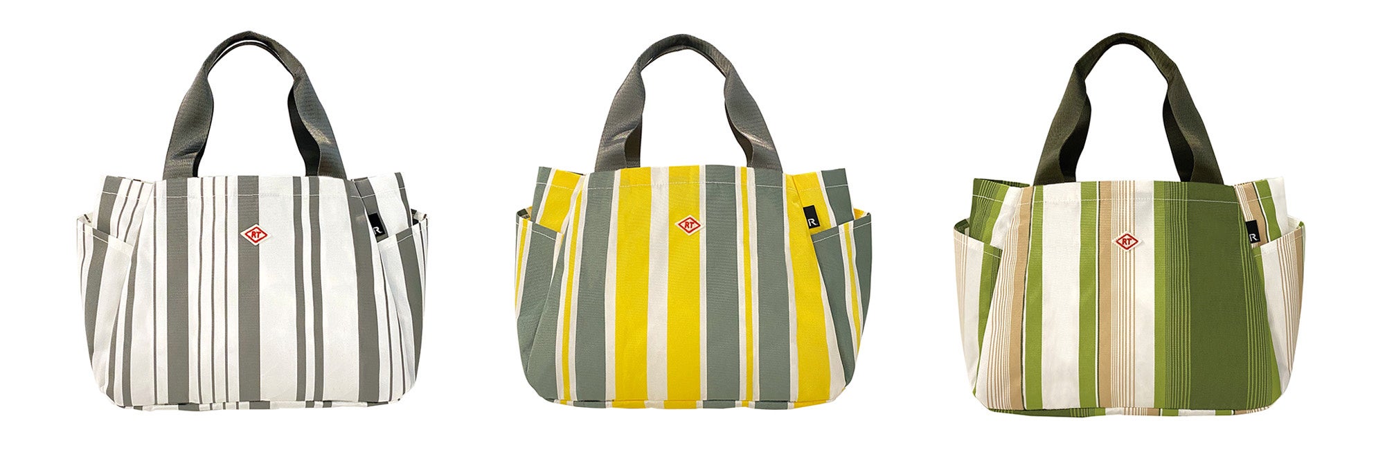 SN.デリ.パルーティ.ハッスイ-B 4,620円(1459 01 gray line、02 yellow line、03 olive line)サイズ:W32×H23×D14cm 持ち手:38cm 素材:表地/ポリエステル(はっ水加工)、ドットボタン 持ち手/ポリエステル ポケット:外側2箇所、内側3箇所(うちファスナー付1箇所)ホルダー2箇所 ※3月下旬より発売中