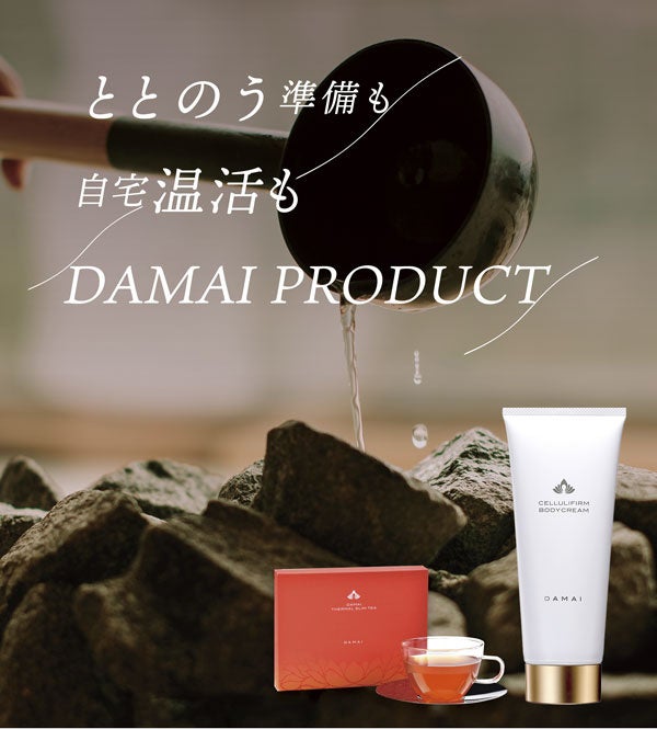 「DAMAI」は、温め、巡り、排出を促し、健康的な美しさを目指すホームケア製品。代官山のサロン「SPA DAMAI」のセラピストが開発し、実際のトリートメントなどの施術でも使用しています。各製品にセラピスト直伝のオリジナルドレナージュメソッドもついてきます。サウナの前後に使用する事で、より快適なサウナライフを送る事ができます。DAMAIの主要製品は全て<温め・巡り・排出>を基軸として開発されています。