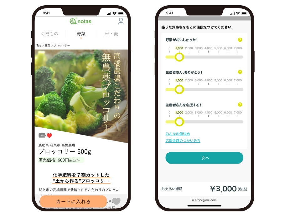 ノウタスを通じた産直市場への「あと値決め」(※2)の提供により、購入者は農作物の食後に農作物の値段を決めることが可能となり、お試し購入や納得感をもった上での応援消費が可能になります。品質に自信のある農家にとっても、こだわりの農作物を販売するハードルを上げることなく、価値に見合った価格での販売を実現することができるようになります。