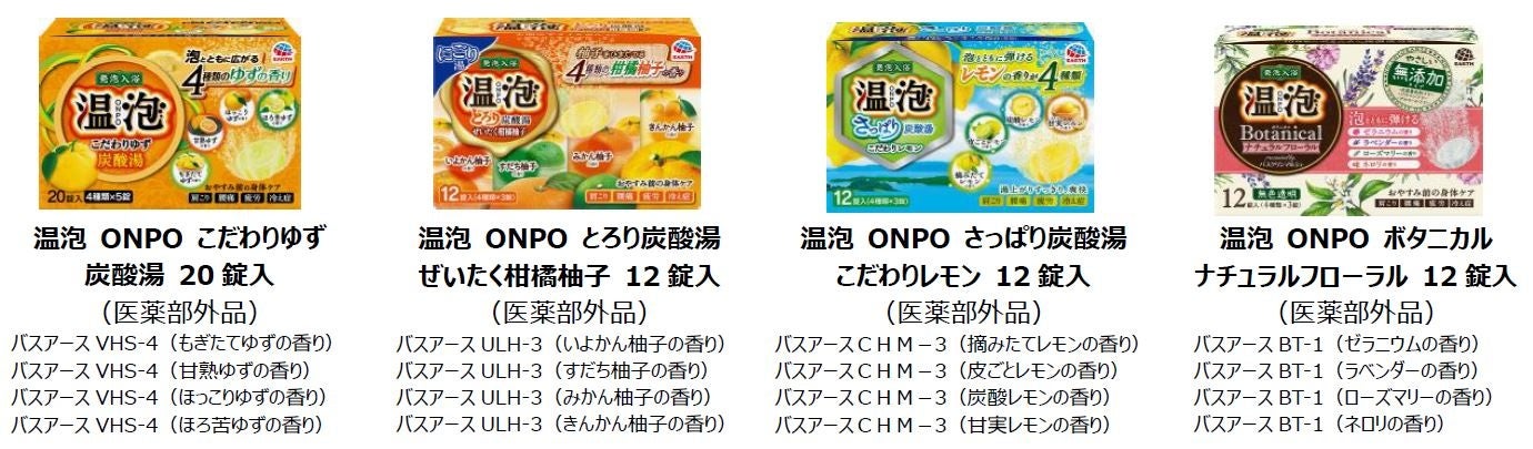 『温泡 ONPO』シリーズは、香りを厳選した天然精油(香料中)や香り成分を配合するなど、香りにこだわった炭酸ガスの入浴剤です。1箱で4種類の香りと湯色を楽しめるアソートタイプで、気分に合わせて毎日さまざまな香りをお楽しみいただけます。