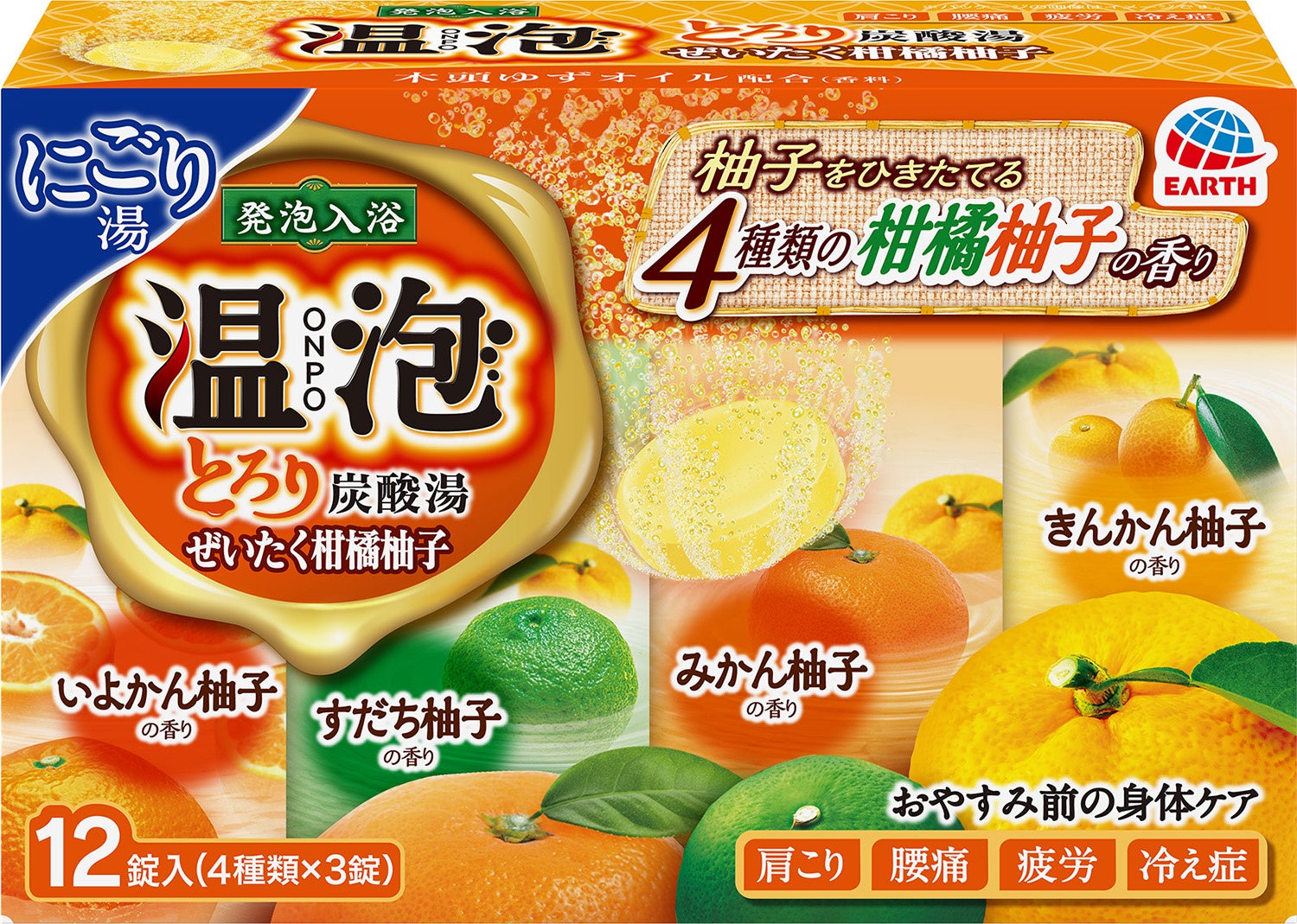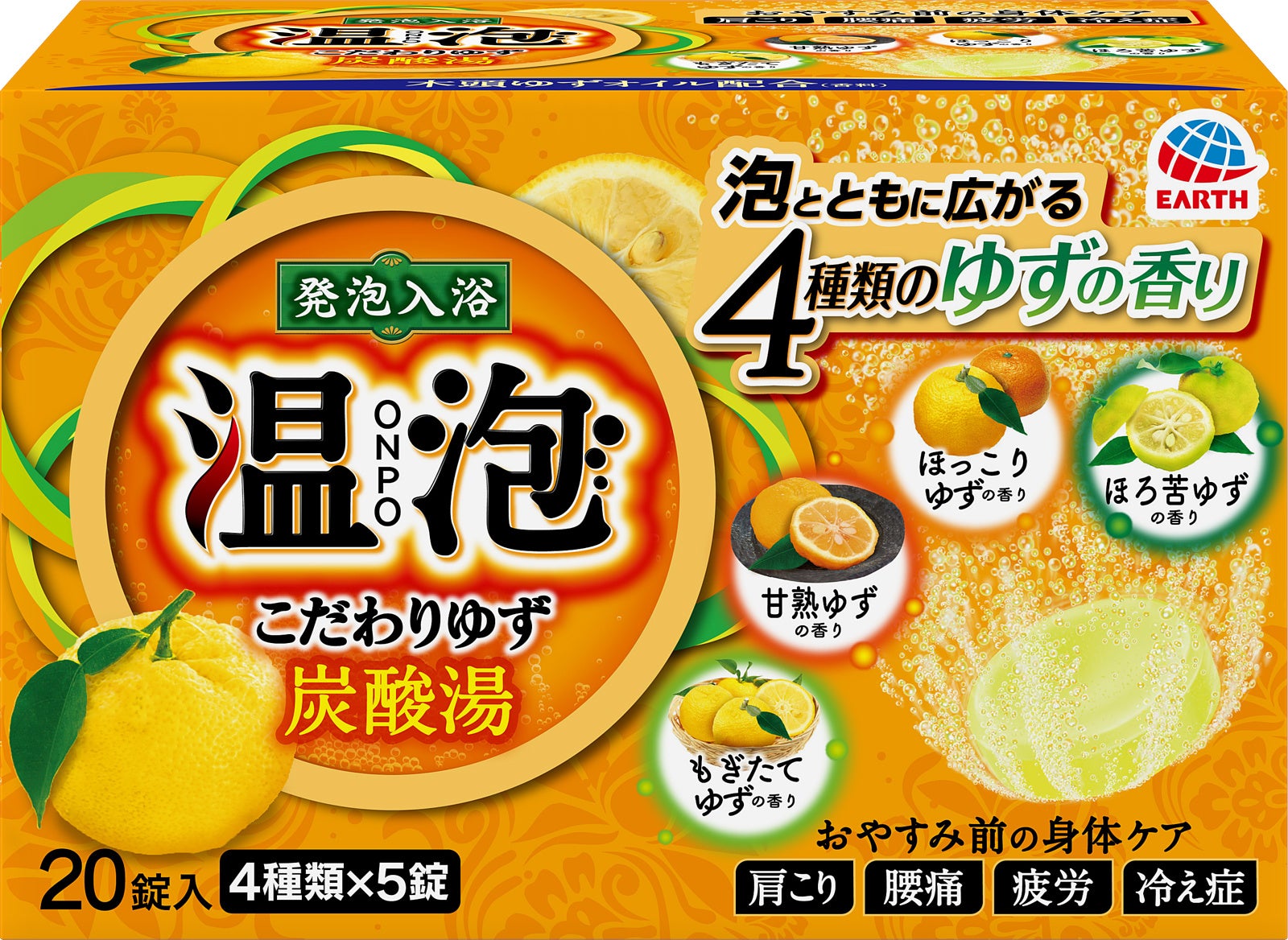 温泡はこだわりの香りの炭酸ガスの入浴剤です。1箱で4種類の香りと湯色を楽しめるアソートタイプで、気分に合わせて、毎日さまざまな香りをお楽しみいただけます。厳選した天然精油(香料中)や香り成分を配合することで、フレッシュでみずみずしい、素材そのものの自然な香りが泡とともに広がります。また、温泉成分※と炭酸ガスが温浴効果を高め、血行を促進し疲れたカラダをいたわります。毎日こだわりの香りを楽しみたい方には『温泡 ONPO』シリーズを、極上の湯ざわりを堪能したい方には『温泡 ONPO とろり炭酸湯』シリーズを、湯上り後のお肌をさっぱりさせたい方には『温泡 ONPO さっぱり炭酸湯』シリーズを、お肌に配慮した設計の『温泡 ONPO ボタニカル』シリーズをぜひお試し下さい。