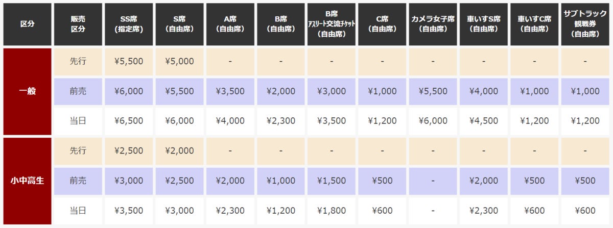 SS席は最上位グレード席。テーブル・コンセント付きの席なので長時間の観戦に最適!購入者にはオフィシャルプログラムと特別協賛の山崎製パンさまよりランチパックもプレゼント。購入時に早い者勝ちで座席指定ができますので、是非お早めにお買い求めください!