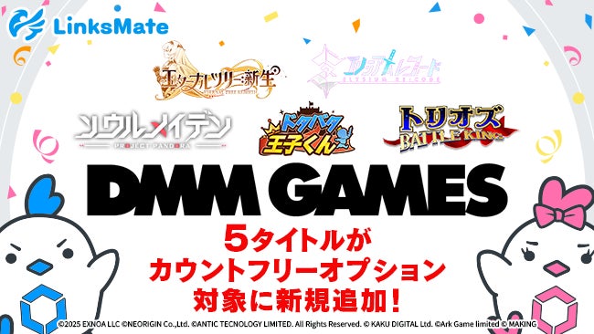 株式会社LogicLinks(以下LogicLinks、本社:東京都渋谷区、代表取締役社長:春田康一)は、MVNOサービス「LinksMate」において2025年9月18日(木)よりカウントフリーオプション対象コンテンツとして合同会社EXNOA(本社:東京都港区、CEO:村中 悠介)が提供するオンラインゲームプラットフォーム『DMM GAMES』にて配信中の「エターナルツリー:新生」、「エリシアムレコード」、「ソウルメイデン」、「ドタバタ王子くん」、「トリオズ BATTLE KING」を新たに追加することをお知らせいたします。