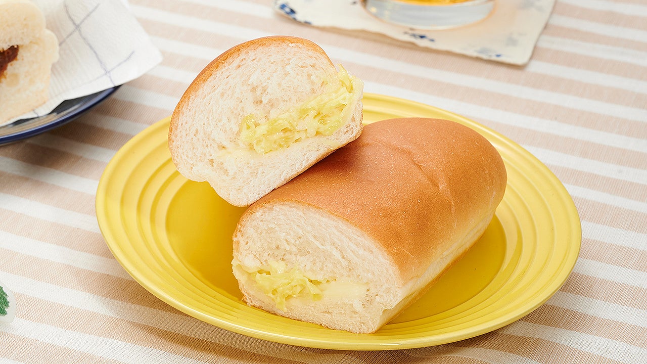 昭和の給食といえば「コッペパン」!コッペパンに細切りのたくあんとマヨネーズを和えサンドしています。たくあんの食感や甘味がマヨネーズやパンと相性抜群です。